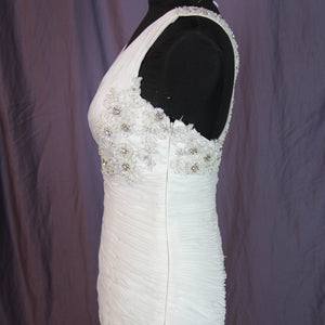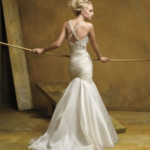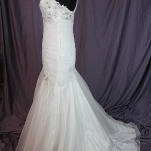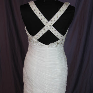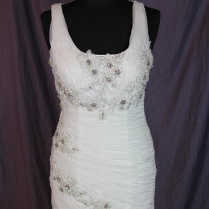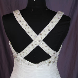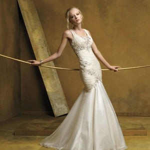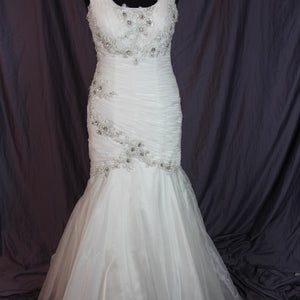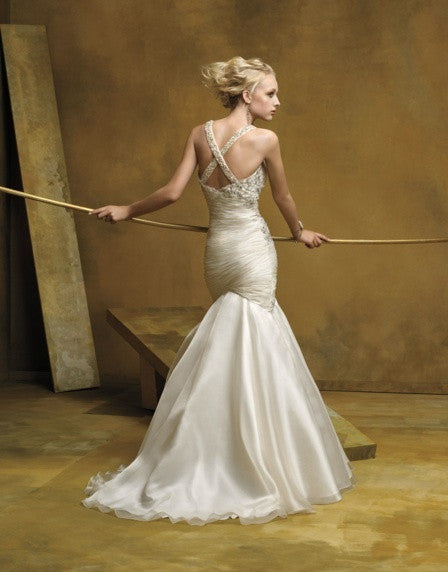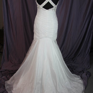 The Coco Anais AN138 is a slimming mermaid design with a scoop neckline, embroidered bodice and waist area, and a flared skirt. X-shaped back straps and a train complete the design.