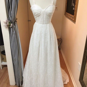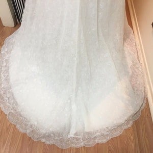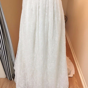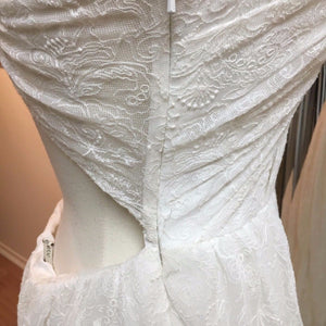 Condition - This is a sample gown in good condition. There is some light fraying near the zipper, minor wear on the lace from being tried on (not very noticeable), and light makeup on the inside of the gown. Since this is a sample gown and has been tried on in the salon, there is light dusting on the hemline and we recommend at least a professional touch up cleaning. The dress needs a little restitching next to the side zipper. The price of the dress reflects it's current condition.