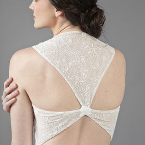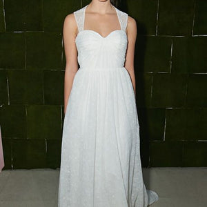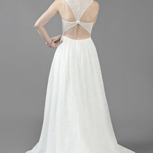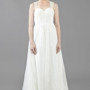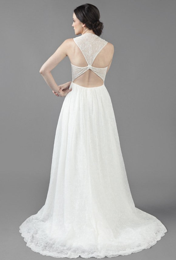 This charming gown from Ivy & Aster seem like something out of A Midsummer Night’s Dream and yet still manages to be perfectly suited to a ballroom, beach or barn for that matter. This sigh-worthy gown has a starburst bodice with contour sleeve, and cut out back with gathered skirt.
