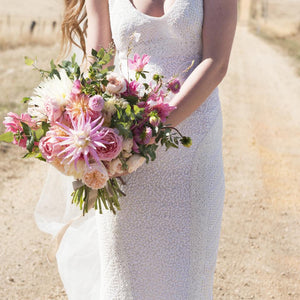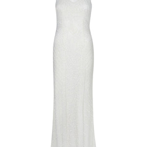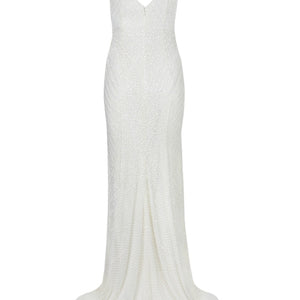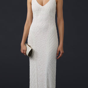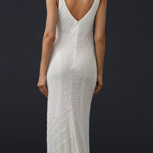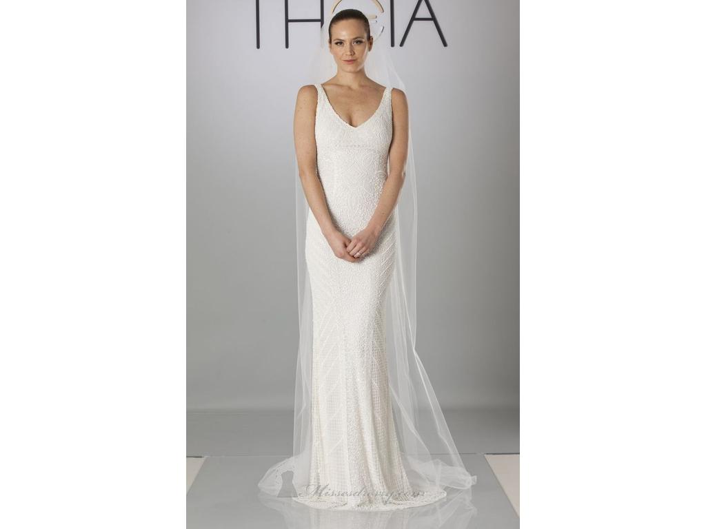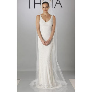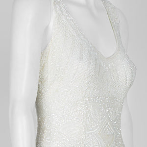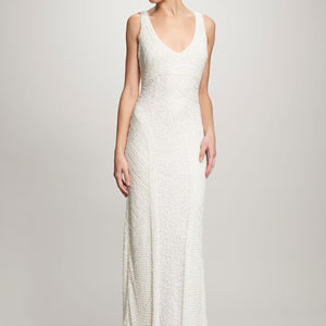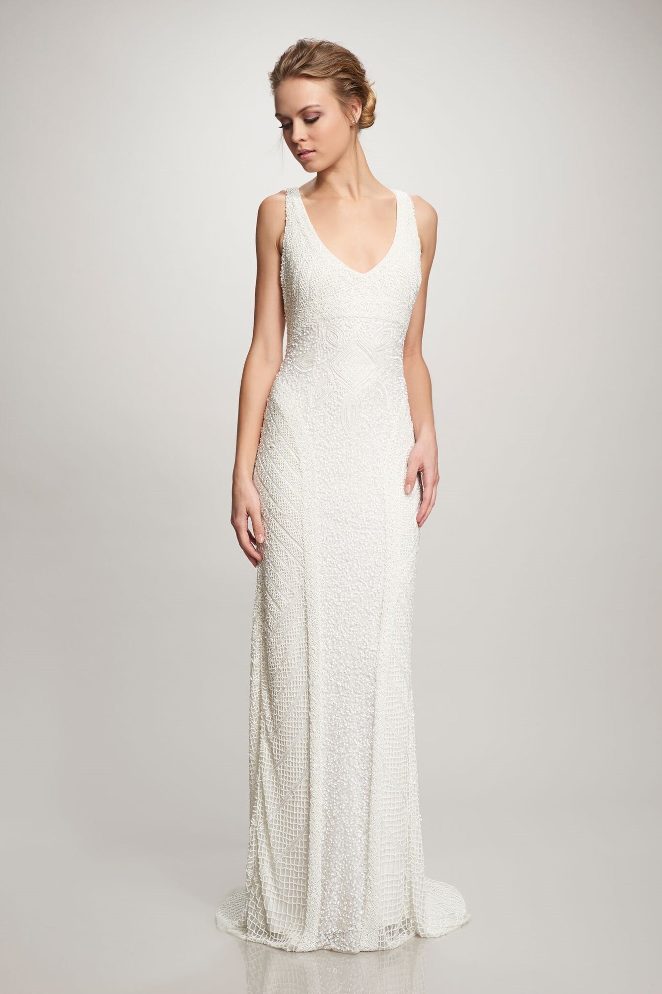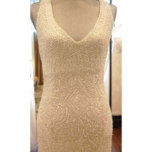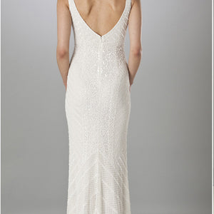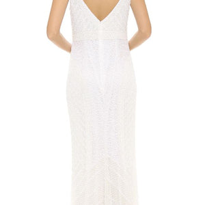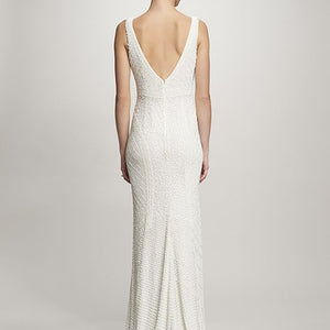This graceful Theia gown is covered with intricate, pearlescent beading and sequins, lending a rich art-deco feel to the floor-length silhouette. Elegant deep V neckline and matching V back. Sleeveless. Hidden back zip. Fully lined.