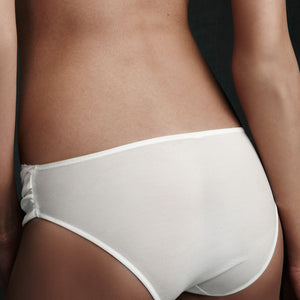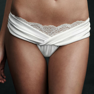 Spun of the softest stretch silk, our lace-edged pairing features ruched culotte bikinis and a bow-topped bralette.
