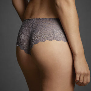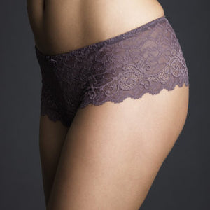 Cut from scalloped stretch Chantilly lace, Simone Perele’s dusky purple layer is timelessly seductive.