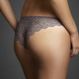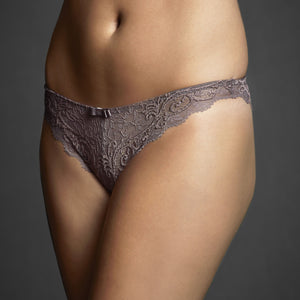 Cut from scalloped stretch Chantilly lace, Simone Perele’s dusky purple layer is timelessly seductive.