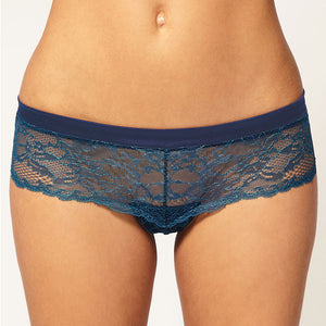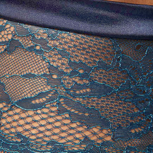 In Mimi Holliday’s refreshing break from basic black, a lacy wave of stormy cerulean skims over a plunging neckline of deep-ocean-blue silk.