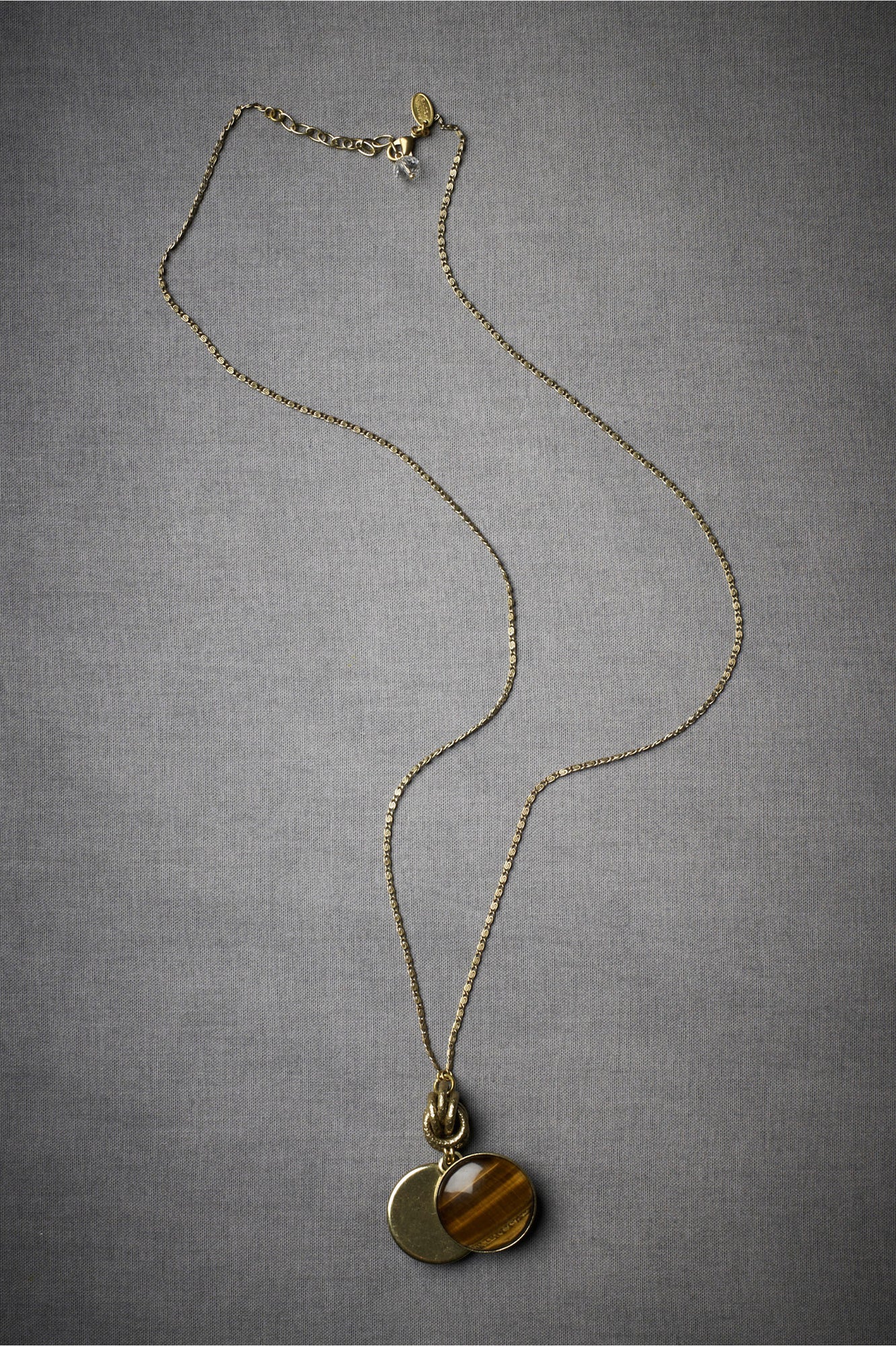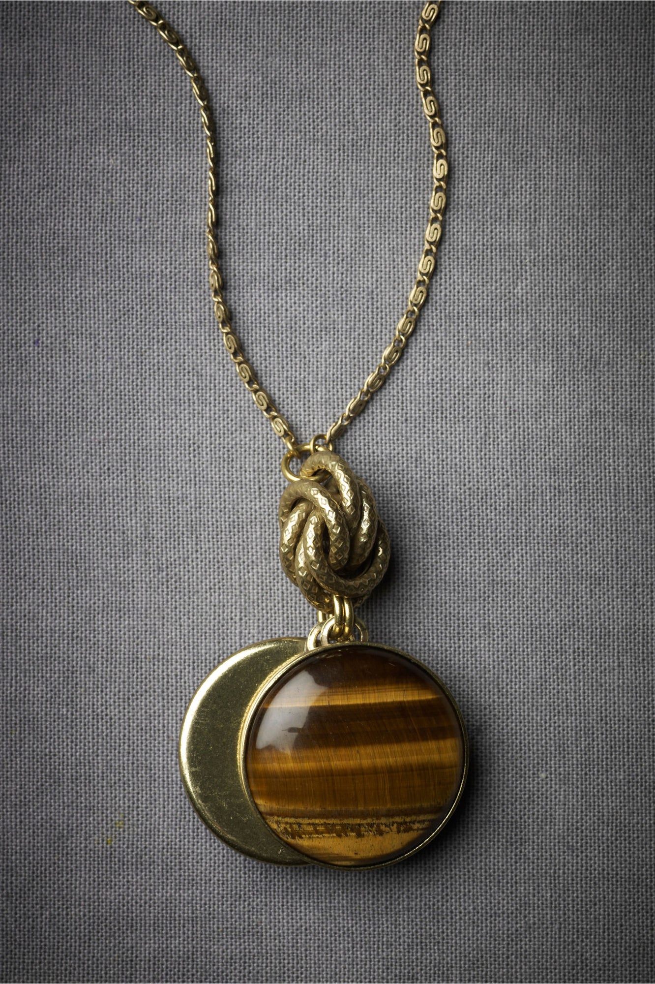 A dynamic coupling not unlike your own, this perfect circle under a vintage knot is double-sided with disks of lapis lazuli and tiger’s eye.