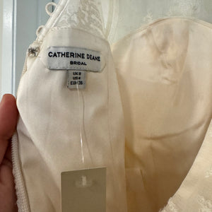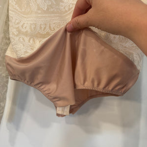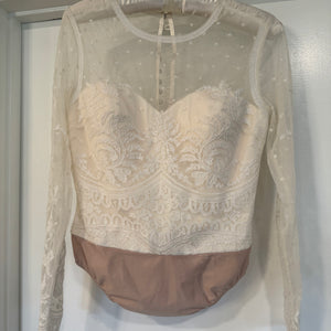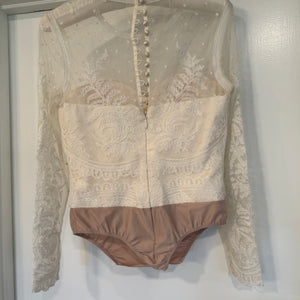 Size 4. This bodysuit is damaged and needs a new snap below the waist. The bottom of the bodysuit has been cut and needs to be repaired. See last 4 pictures. Otherwise the bodysuit is in excellent condition. Price has been reduced accordingly. Retail price: $590!