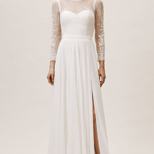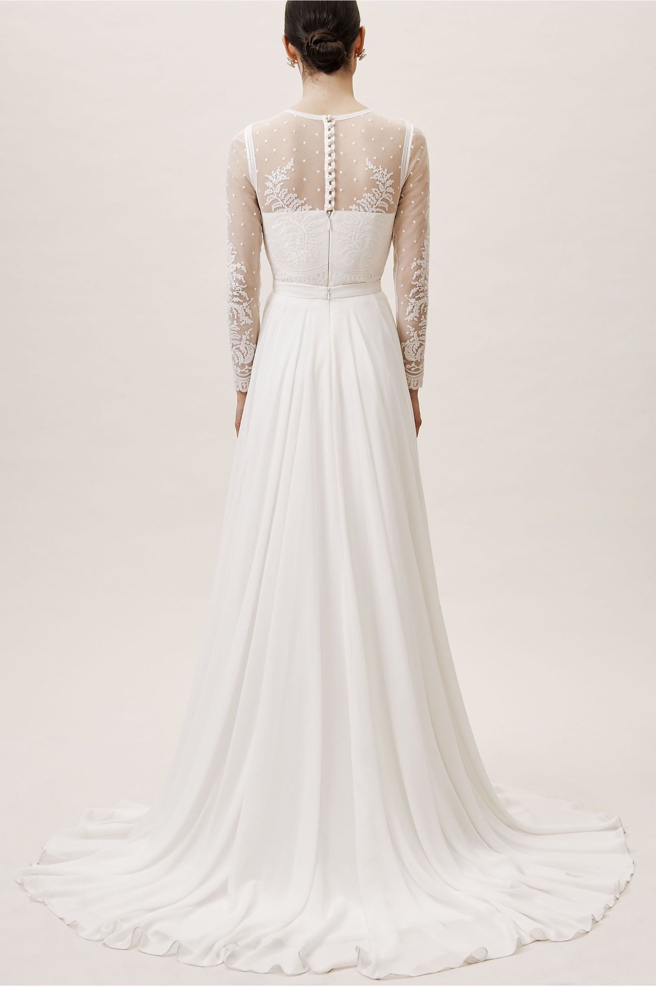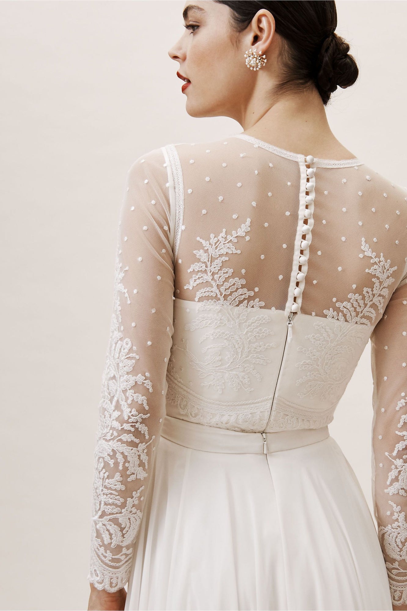 Crafted from ethereal tulle, this long-sleeved bodysuit is embroidered with intricate florals, understated dots, and a delicate trim. The end result is nothing short of regal. By Catherine Deane.