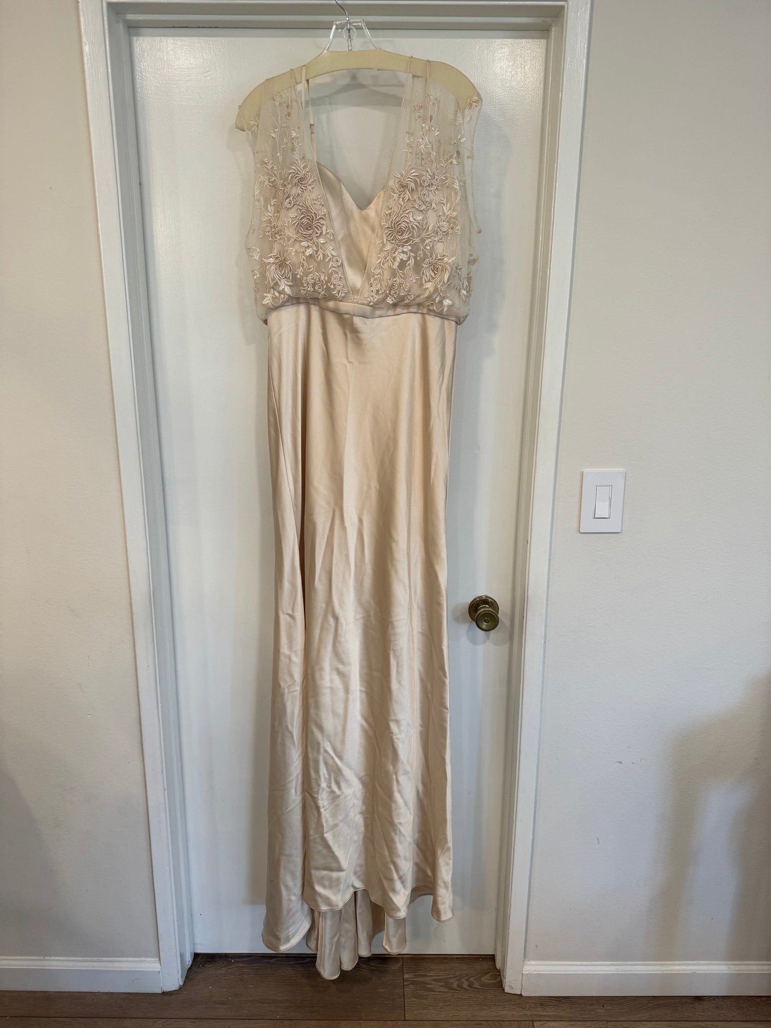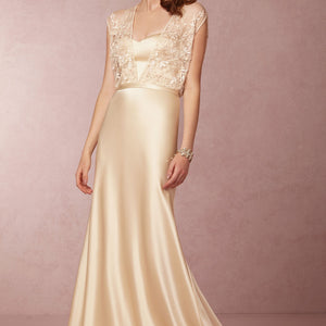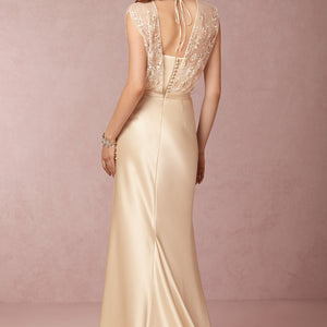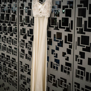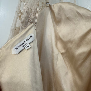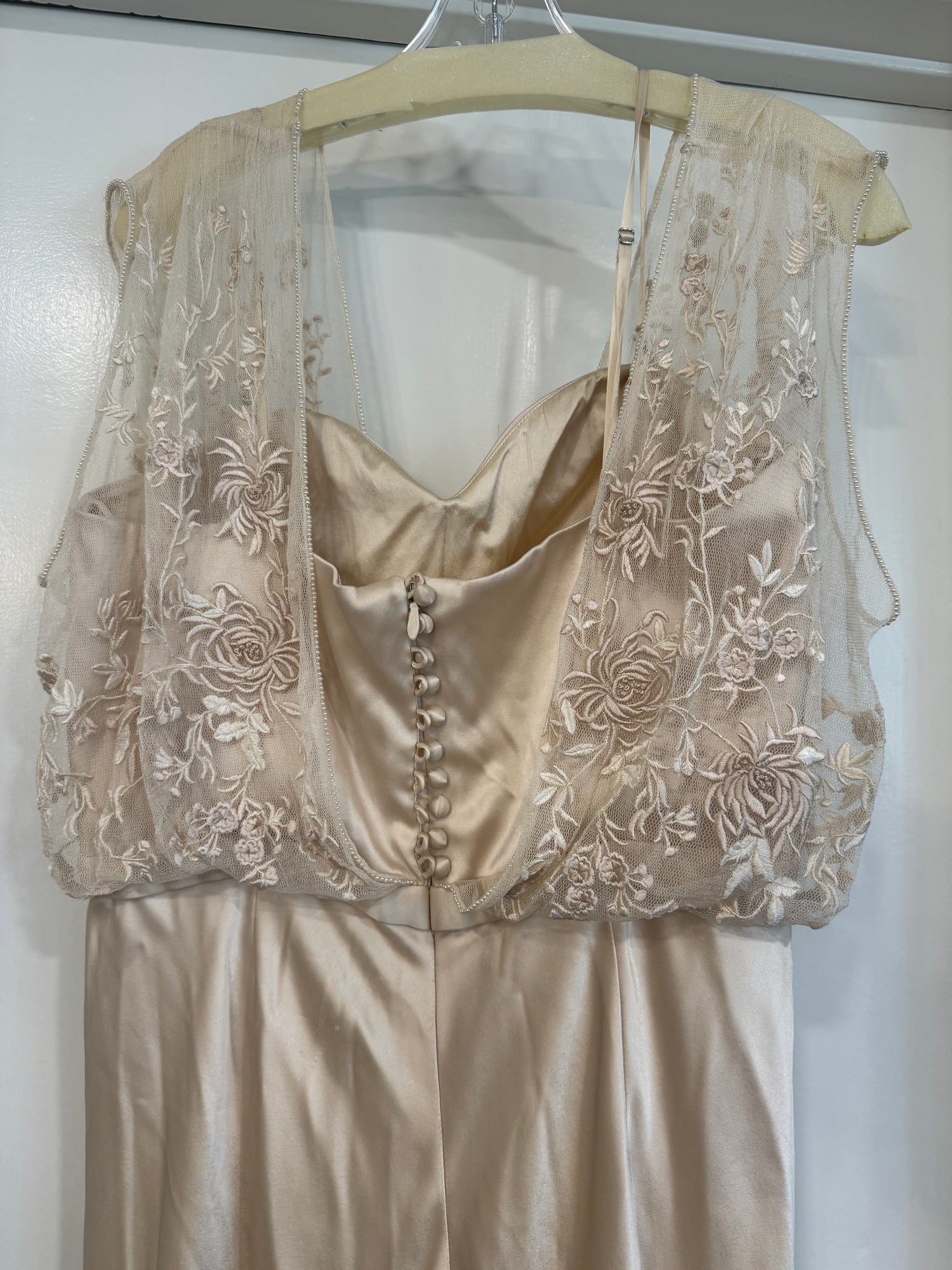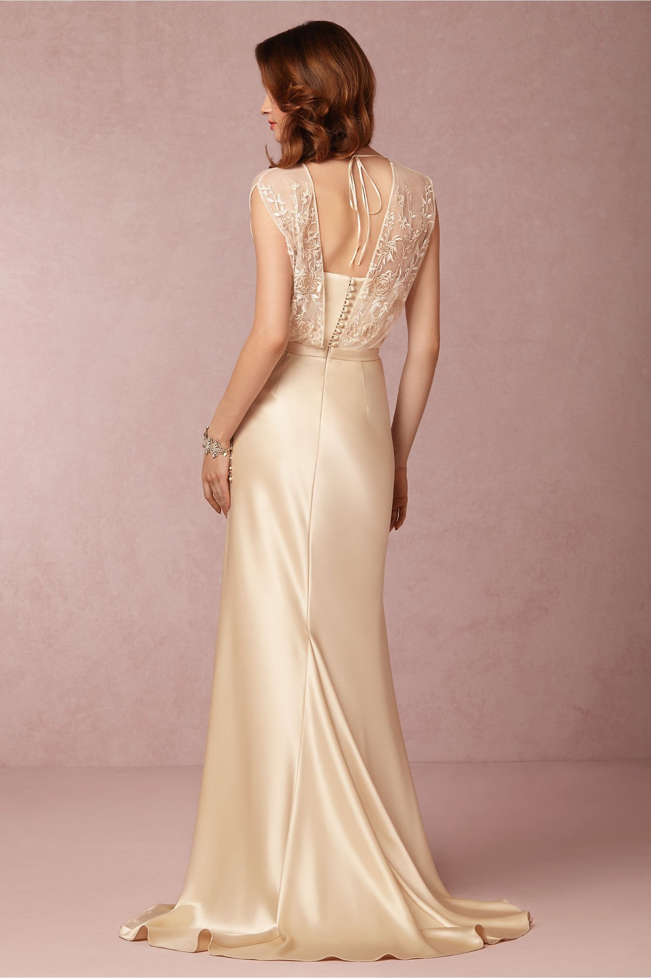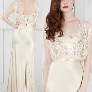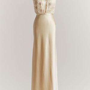 Born in Ireland, raised in South Africa, and based out of London, Catherine Deane’s designs are inspired by her nomadic lifestyle, as well as her passion for Victorian-era craft techniques and exceptionally soft fabrications. Featuring sheer silk tulle sleeves with floral embroidery and a column silk skirt, this slinky gown has a sophisticated, bohemian air, with its vintage-inspired blouson silhouette and warm, cream-hued satin.
