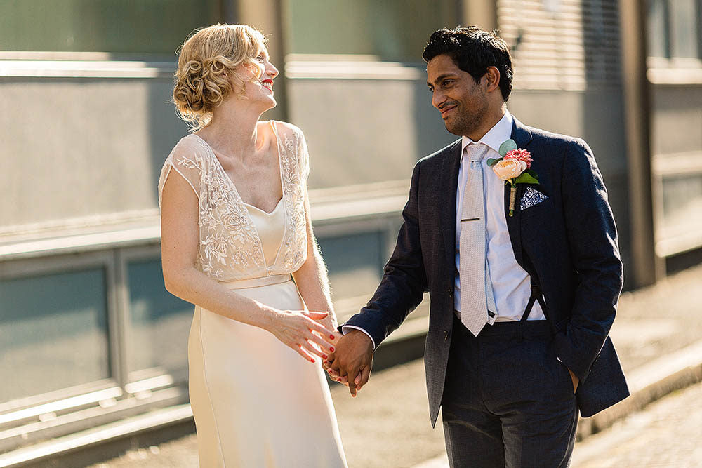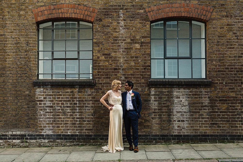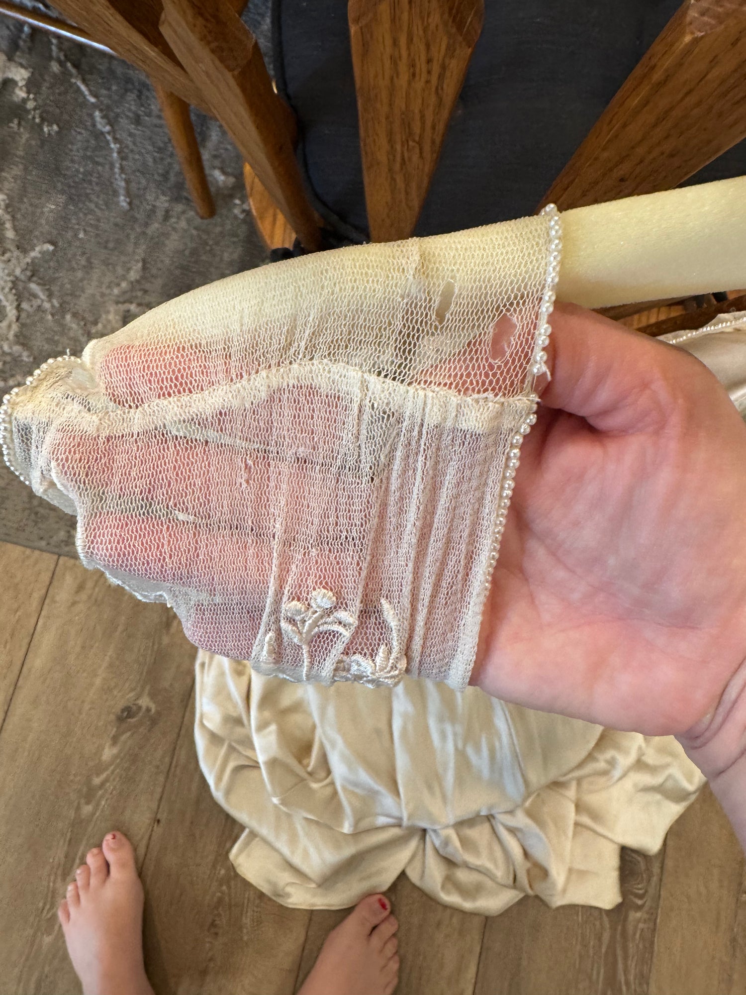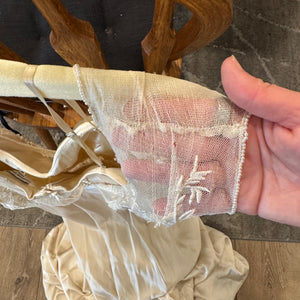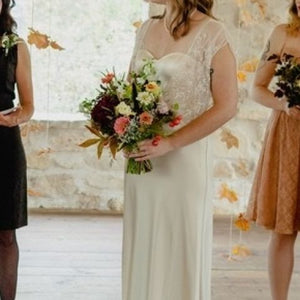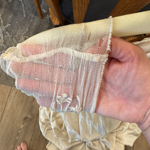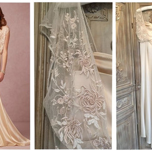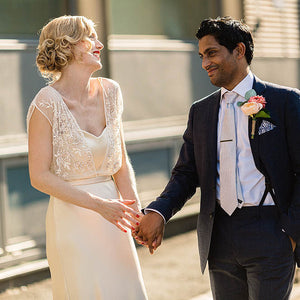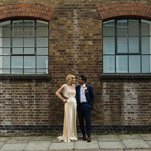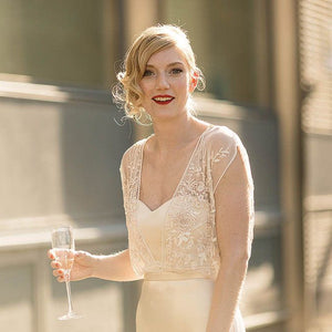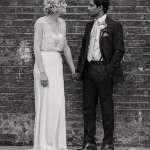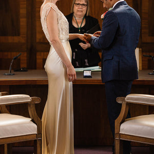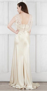 Born in Ireland, raised in South Africa, and based out of London, Catherine Deane’s designs are inspired by her nomadic lifestyle, as well as her passion for Victorian-era craft techniques and exceptionally soft fabrications. Featuring sheer silk tulle sleeves with floral embroidery and a column silk skirt, this slinky gown has a sophisticated, bohemian air, with its vintage-inspired blouson silhouette and warm, cream-hued satin.