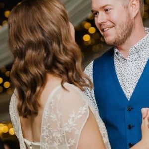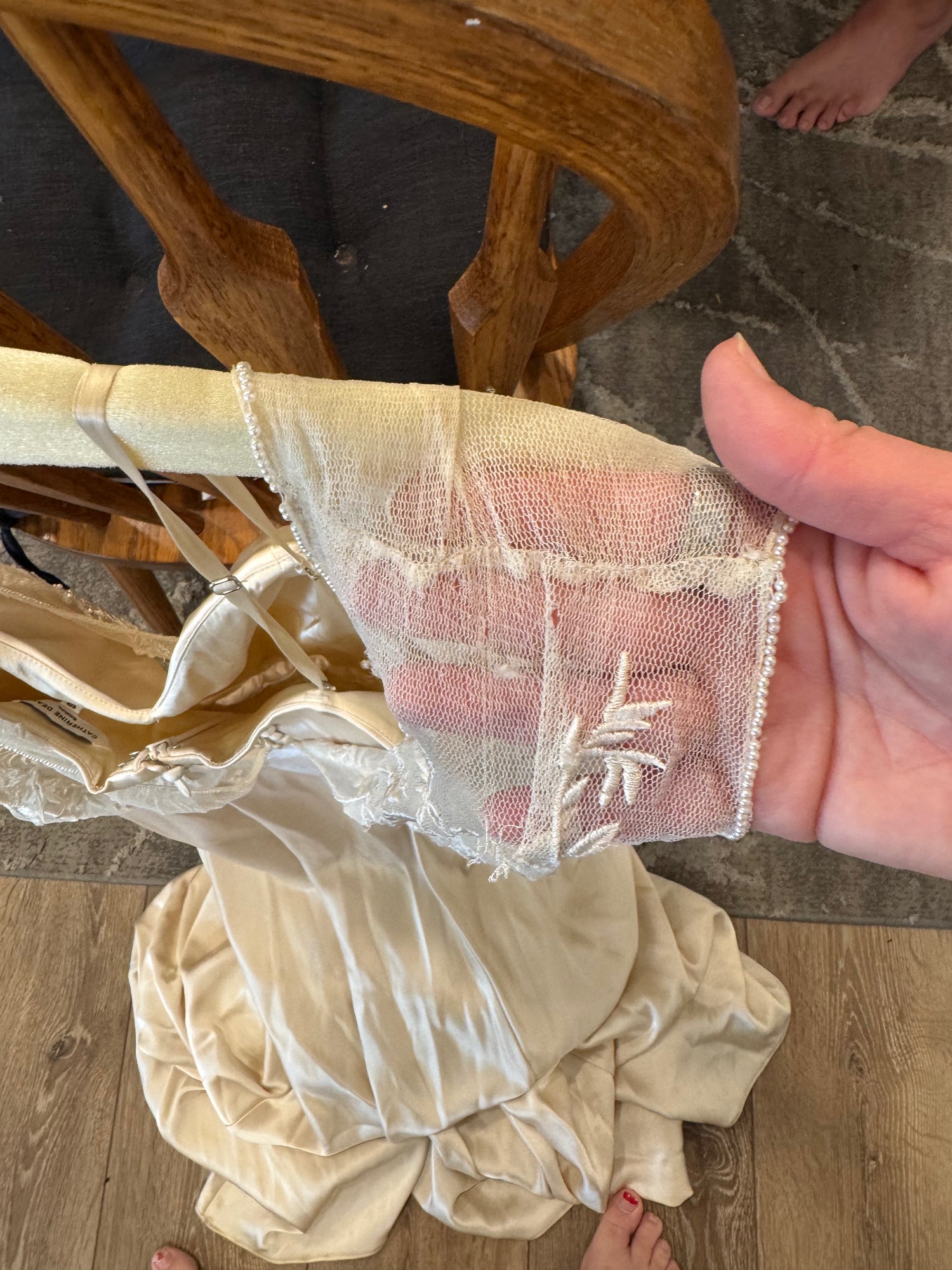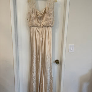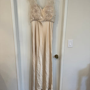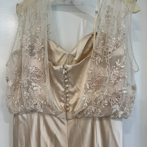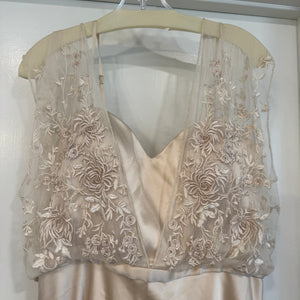 Sample gown that has been tried on in store.  A few minor imperfections on the top of the shoulder (a few small holes on the silk near the seam of the shoulder area).  See last few pictures of actual dress.  A seamstress can take it in slightly on the shoulder area to remove this imperfection. Never worn outside the salon and never altered. Price has been reduced accordingly.  Retail price: $1,400.