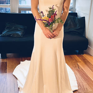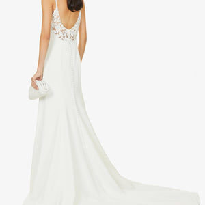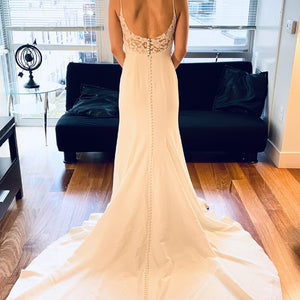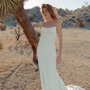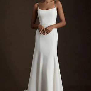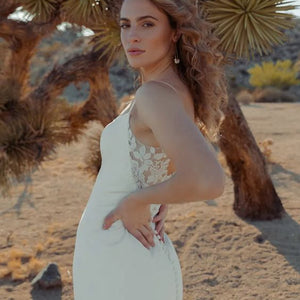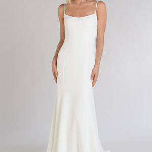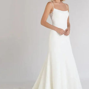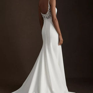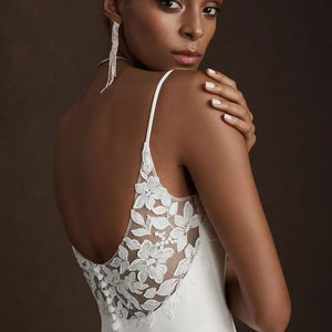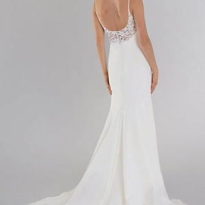 The Caleb scoop neck bridal gown is stunning in her simplicity. Delicate spaghetti straps highlight your shoulders and collarbone, and a modern scoop neckline flatters your décolletage. The sleek fit and flare silhouette accentuates your figure while thoughtful back details add just the right amount of romance. The sheer illusion scoop back is adorned by delicately embroidered florals, and covered buttons down to the hem add a classic bridal touch. Finished with a chapel-length train, this piece is just the thing for a breathtaking entrance on your special day.