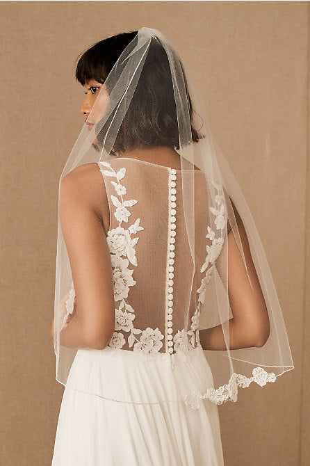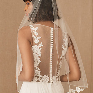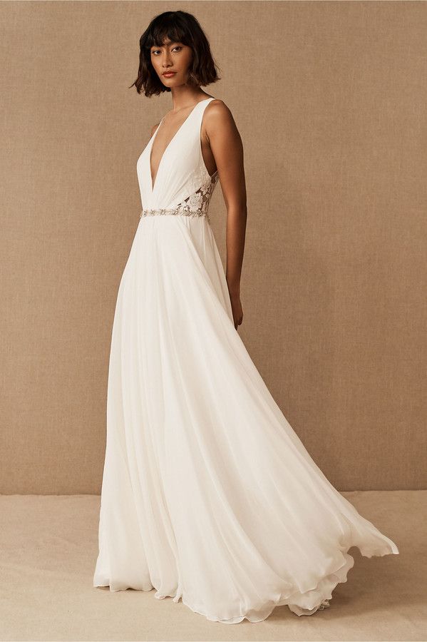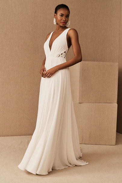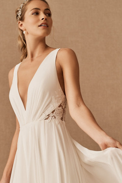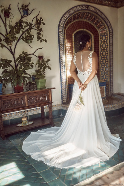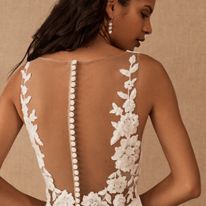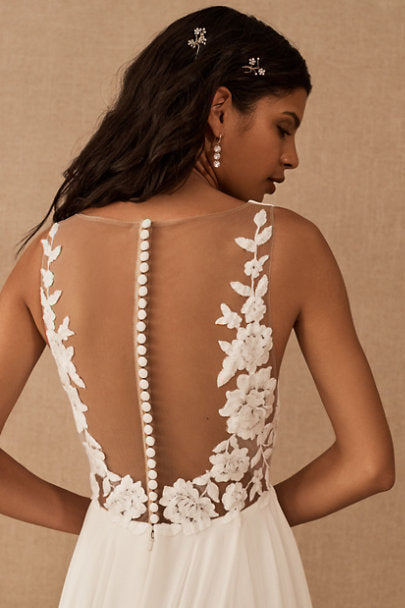 Intricate florals frame the sheer illusion back of this sweeping gown and peek from subtle side cutouts at the waist. A plunging V-neckline and button details complete the look. By Jenny Yoo.