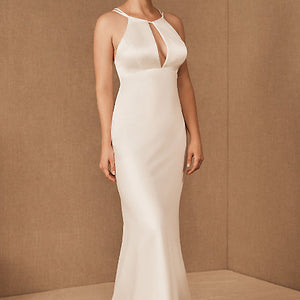 Slinky and modern, this bias-cut gown’s highlight is the bold keyhole neckline accented by strappy back details. The charmeuse lining and subtle train add a soft touch of romance. By Nouvelle Amsale.