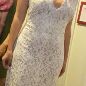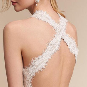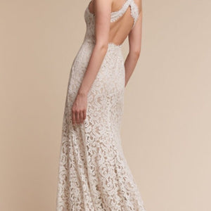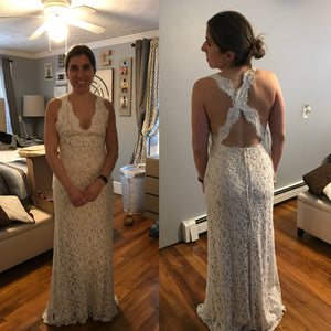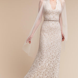Lace in full bloom is fashioned into an understated column gown. Its magic lies in the details: a flattering v-neckline and crisscross back. Easily packable, it's the perfect gown for a destination wedding. By Tadashi Shoji.