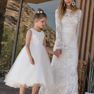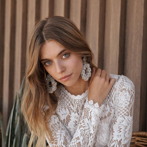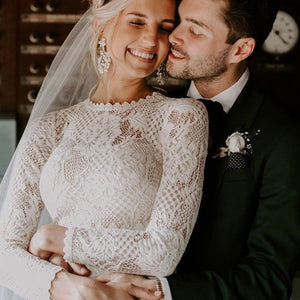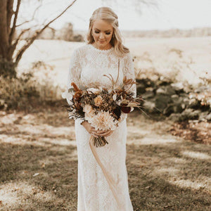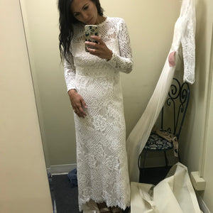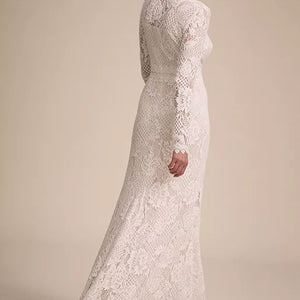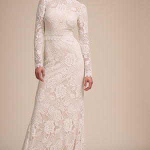With a high-neckline and illusion detail down the long-sleeves, this lace column gown is a true showstopper. The Tenley Gown is adorned with all over graphic lace + paired with a romantic silhouette. This gown is a bohemian bride's dream. By Tadashi Shoji.