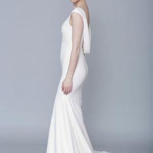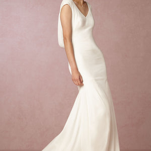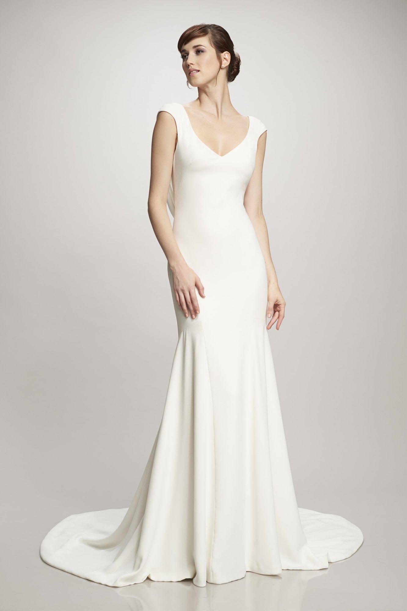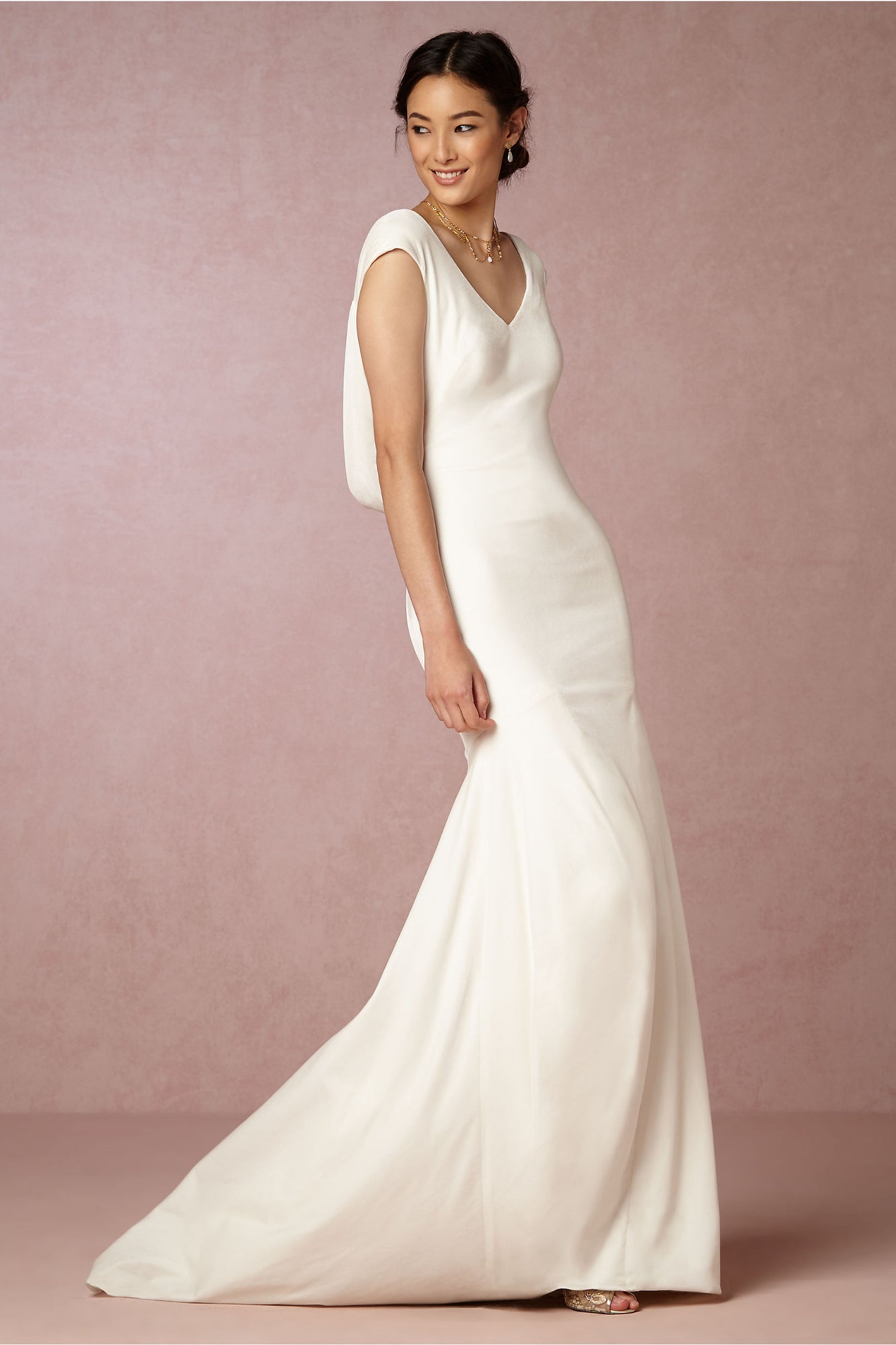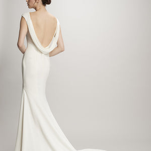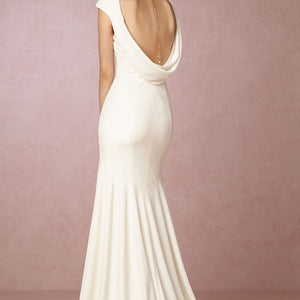 We promise this sophisticated velvet column gown, with its draped, low cowl back and stunning train, will turn heads. Perfect for an elegant fête. An exquisite Theia gown with simple, yet classic appeal. A deep cowl back reveals a peek of skin, and the long train offers a graceful, yet dramatic finish.