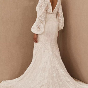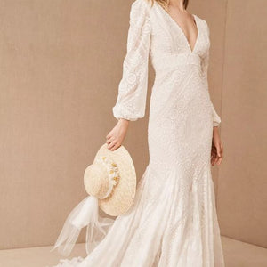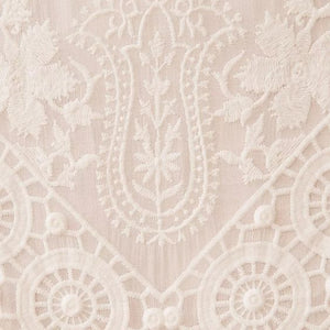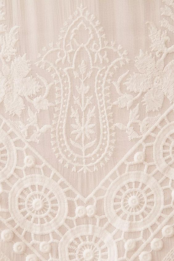 Geometric embroidery and voluminous sleeves make this crinkle chiffon gown the ultimate statement piece for bohemian brides. Raised stitching introduces luxe texture to the mixed motif embroidery, which is mirrored for a showstopping symmetrical effect.