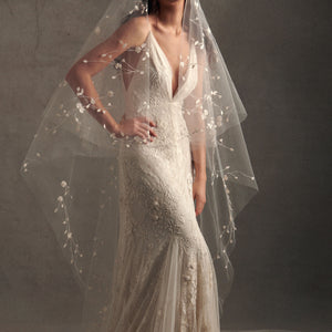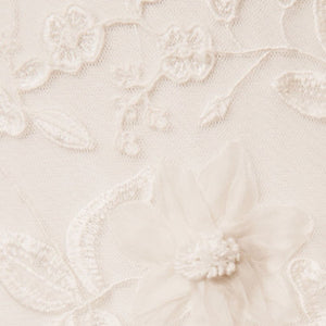Dripping with floral embroidery and dimensional organza applique work, this tulle gown is endlessly romantic. A plunging neckline and low back lend the bodice its sultry silhouette, while a full train makes a dramatic finishing flourish. By BHLDN.