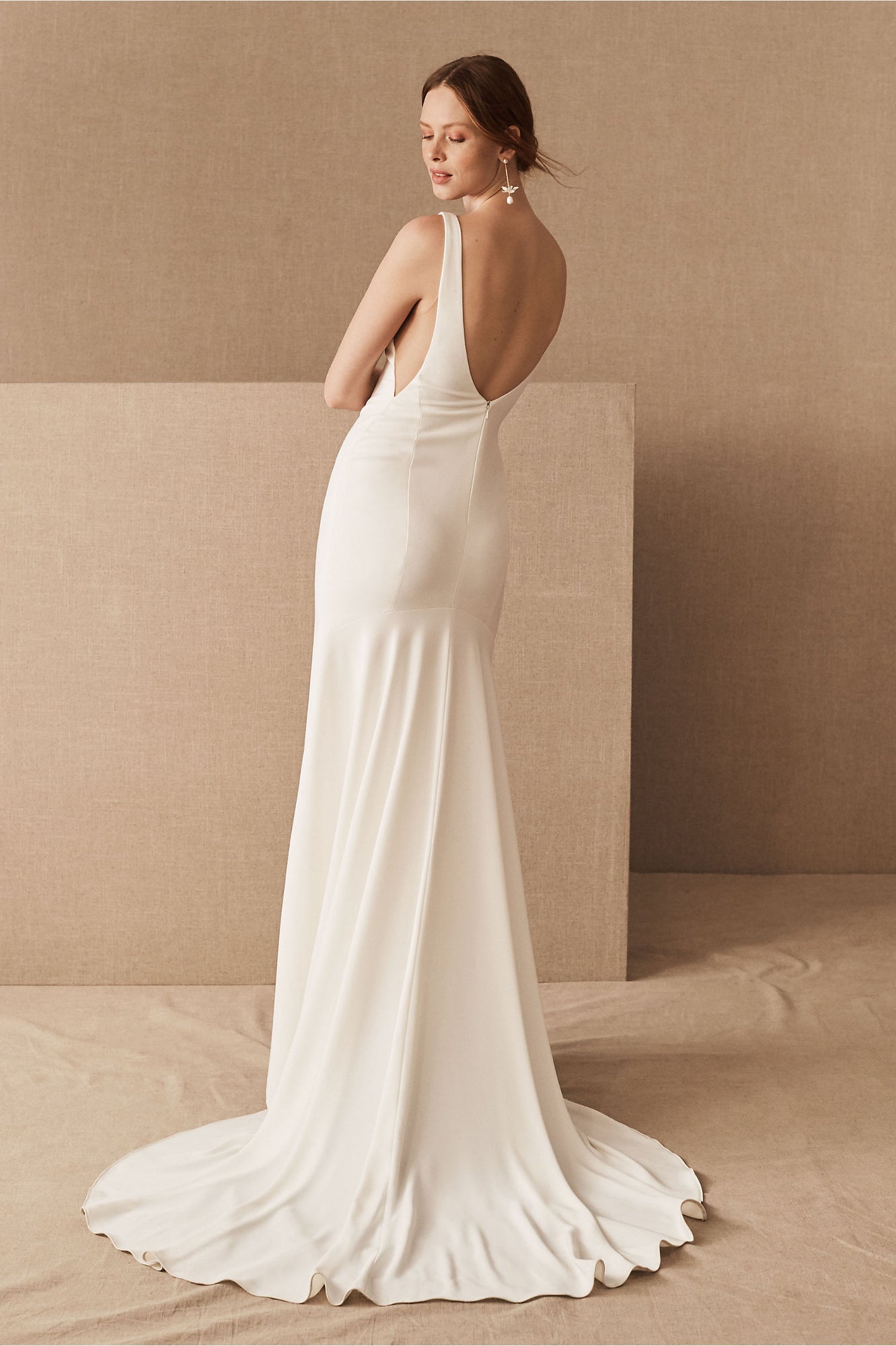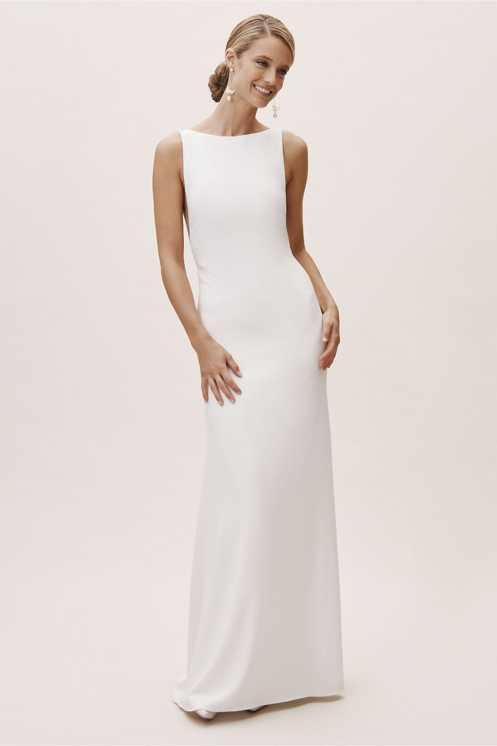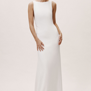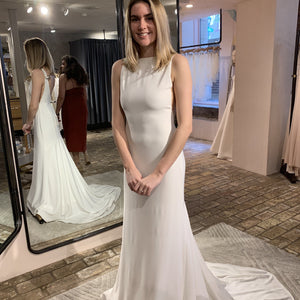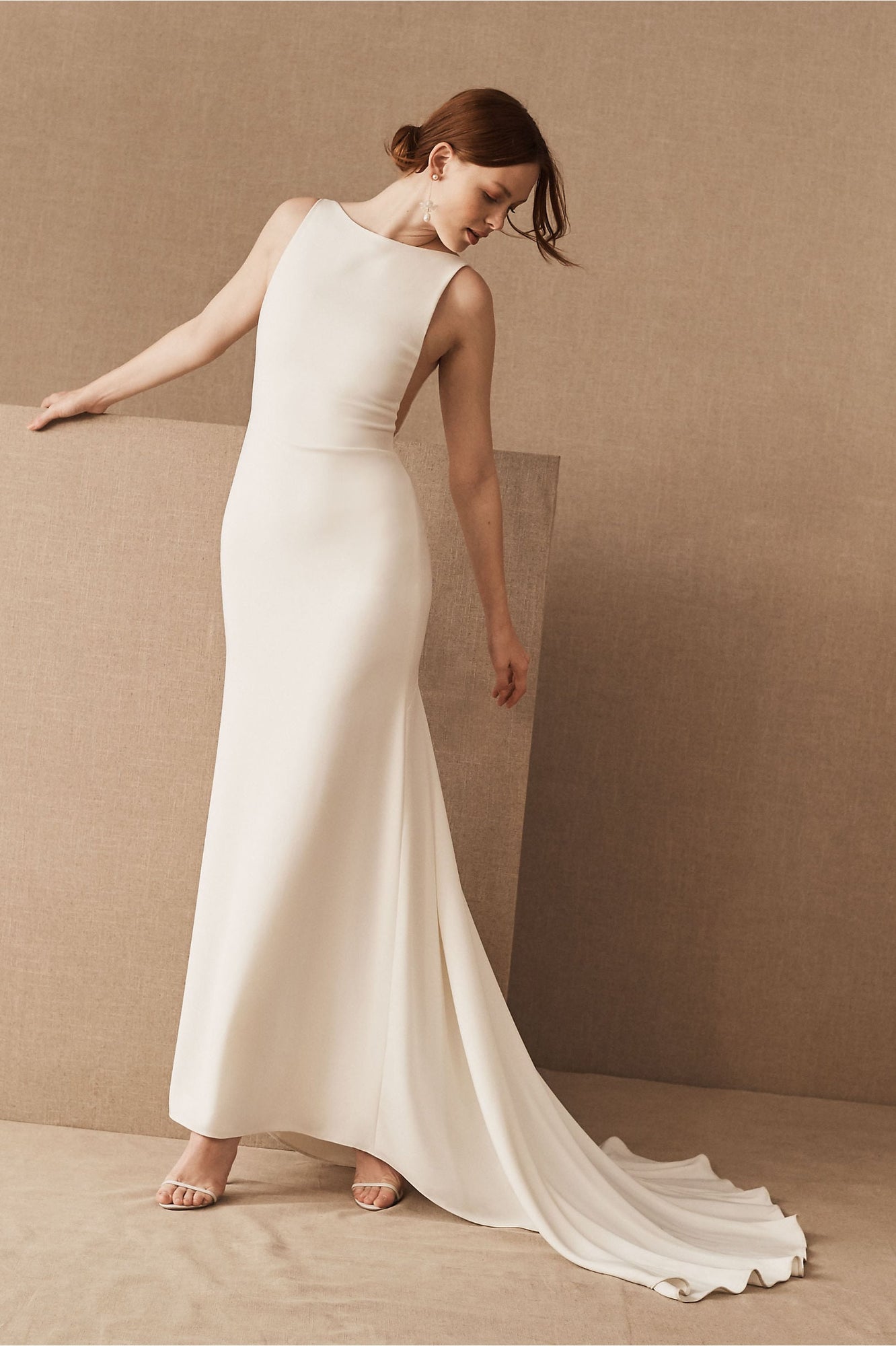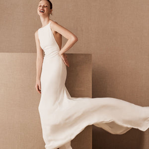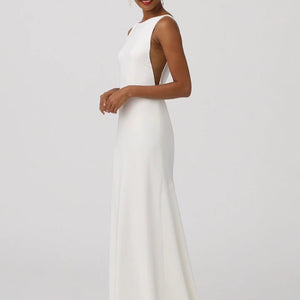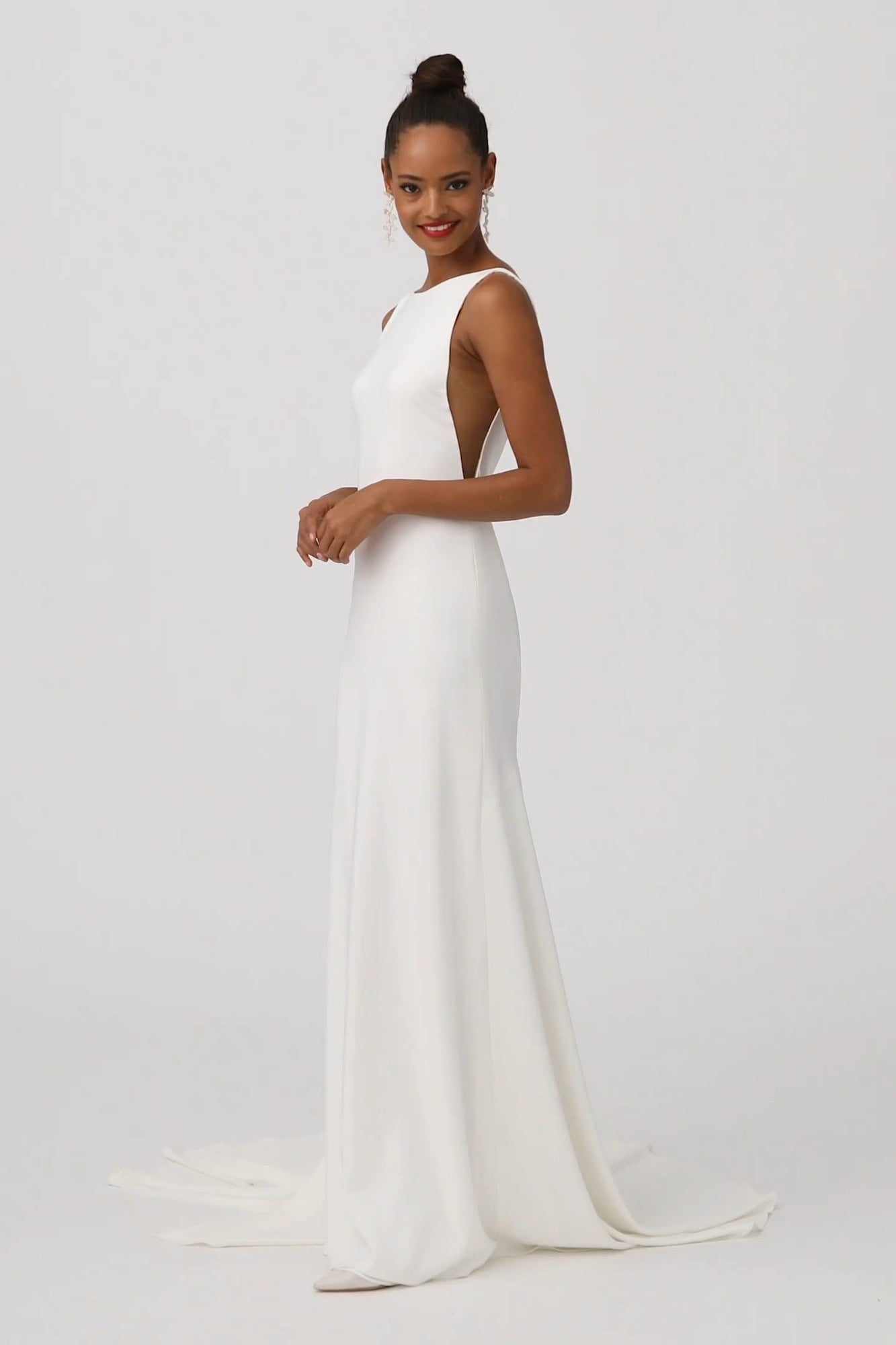 A plunging back and sheer mesh panels lend a sultry vibe to this sleek crepe sheath. With a high-neckline and a figure-flattering fit, it's minimalism at its best. By Watters Bride.