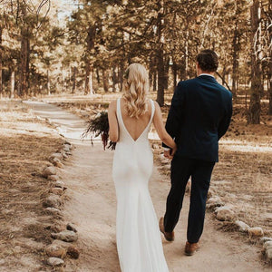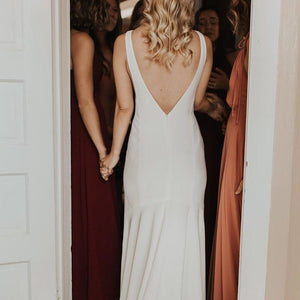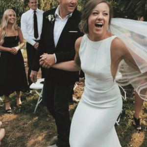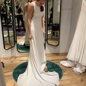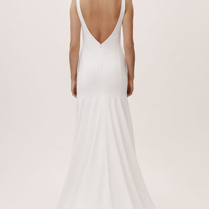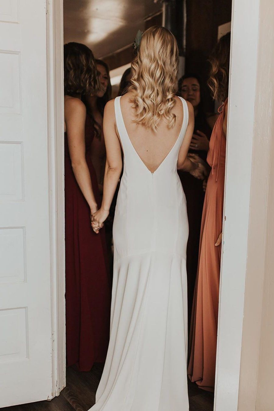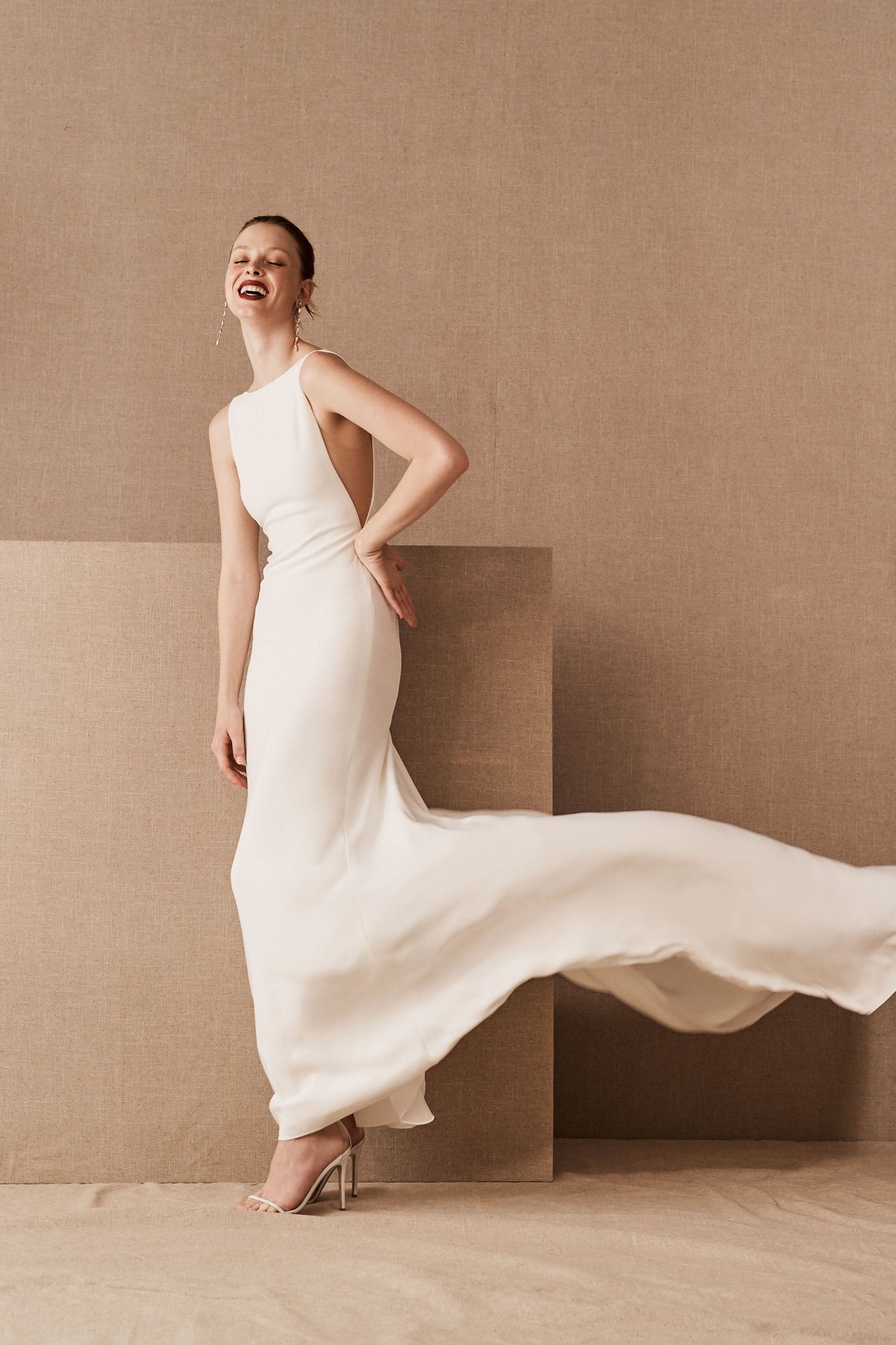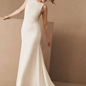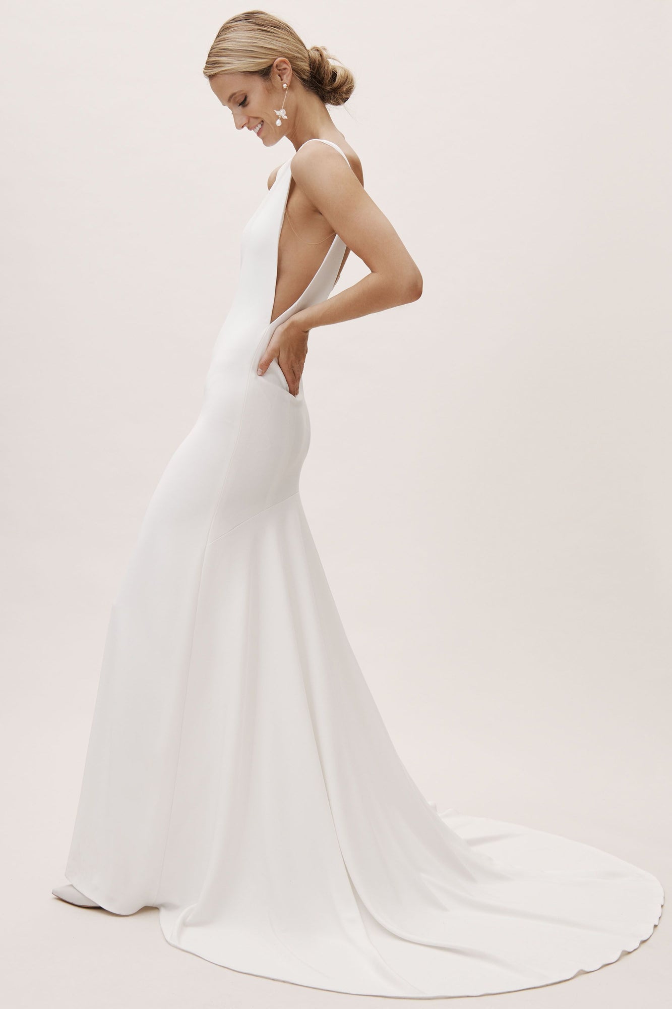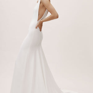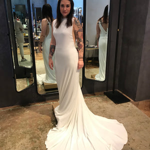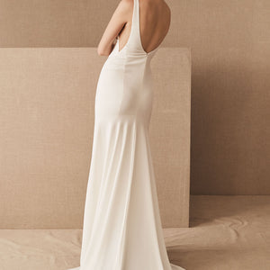 A plunging back and sheer mesh panels lend a sultry vibe to this sleek crepe sheath. With a high-neckline and a figure-flattering fit, it's minimalism at its best. By Watters Bride.