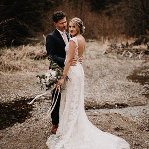 Soft lace is swathed in ivory floral embroidery, perfectly placed to highlight your best assets. The v-neckline and delicate flutter sleeves give way to a sexy open back, while a frothy train completes the look. By Whispers & Echoes.