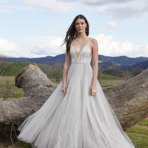 A sweeping train, scattered sequins, and wispy layers of silvery tulle combine to create this dazzling ballgown. We can't guarantee you'll outsparkle the stars, but you just might. By Willowby by Watters.