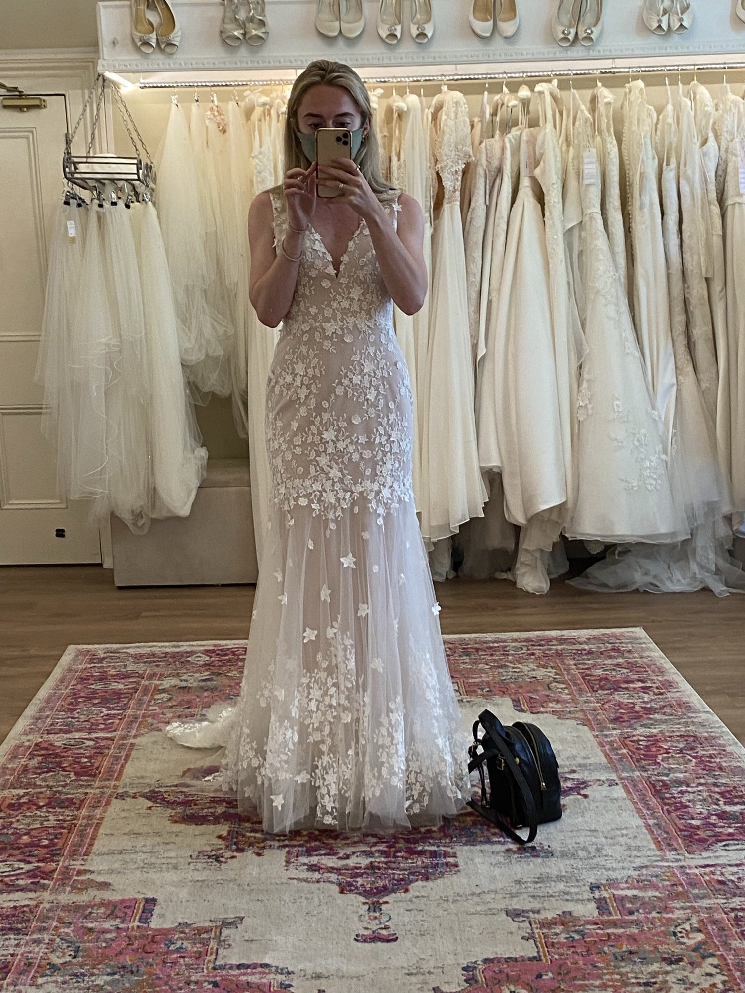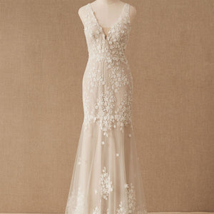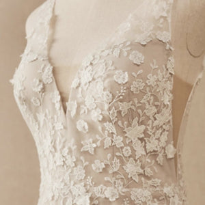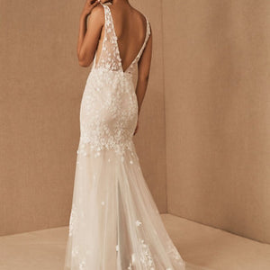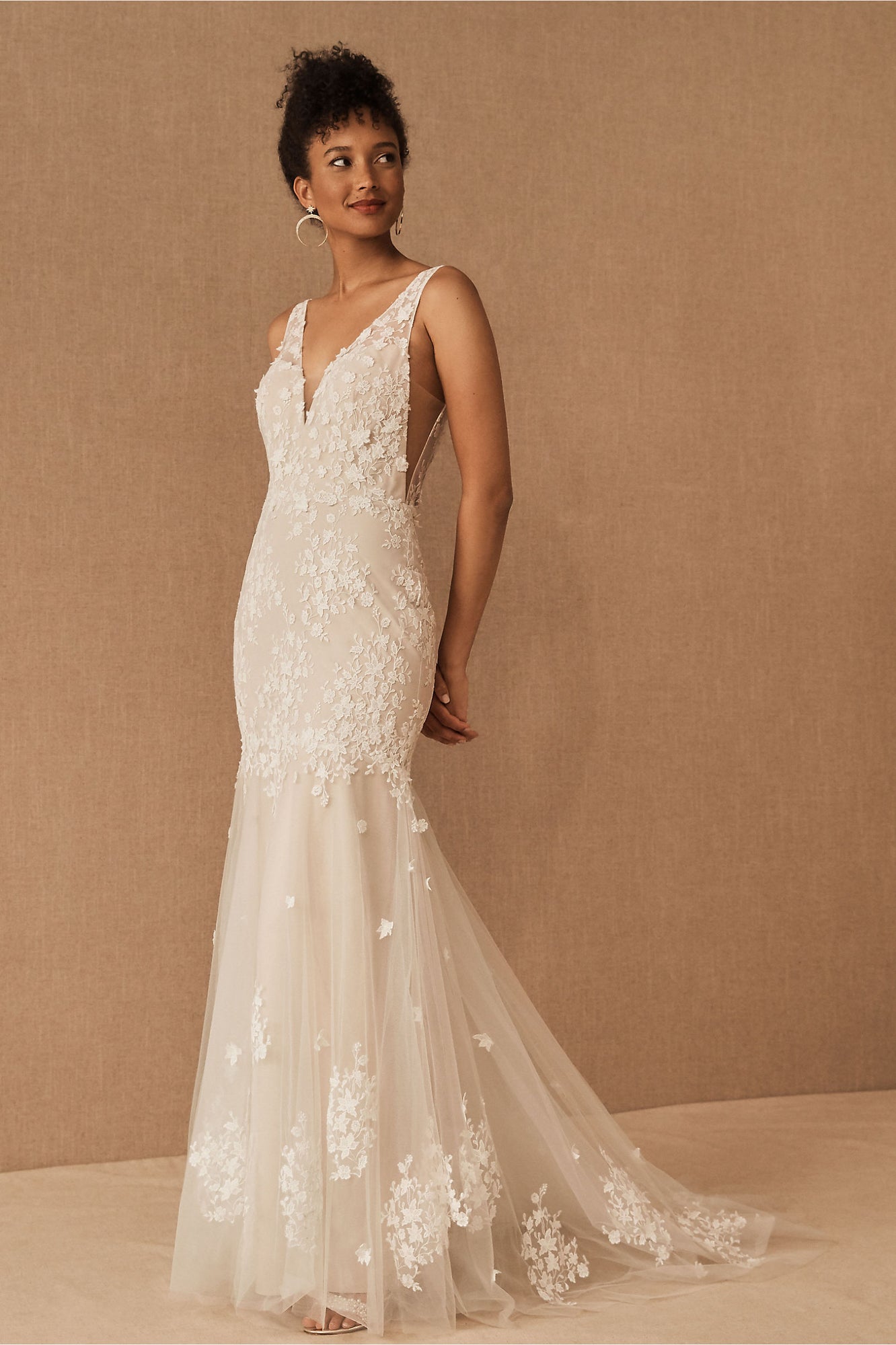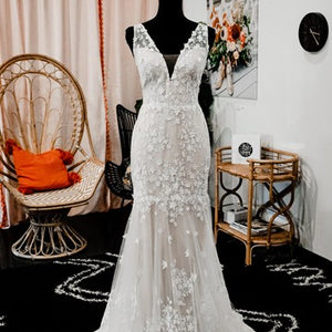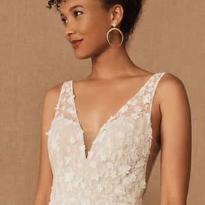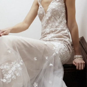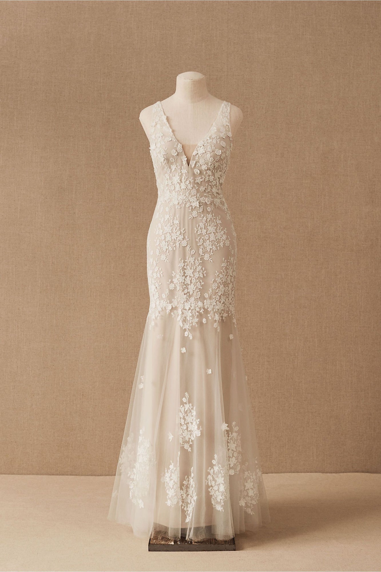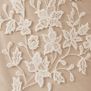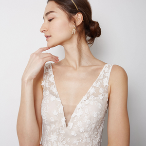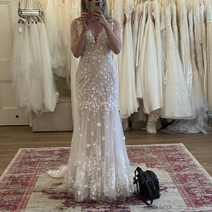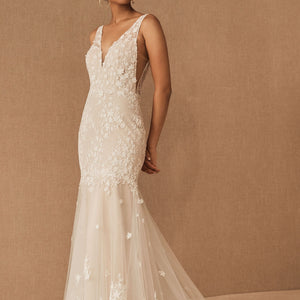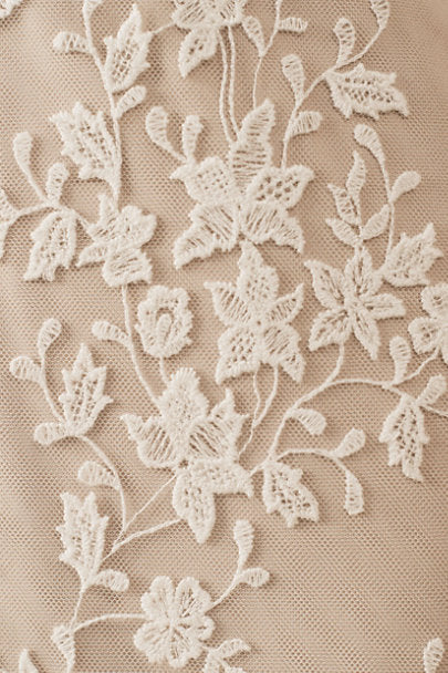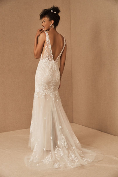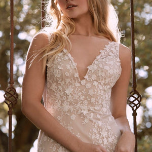 Floral lace is delicately cut and placed to create dimensional detail on this beautifully bohemian gown. A fitted silhouette and classic v-neckline complete the look. By Willowby by Watters.
