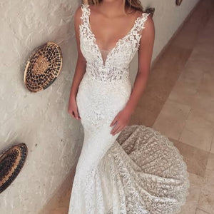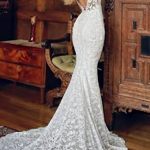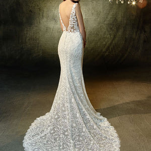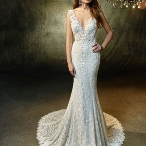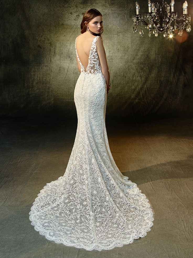 Lovely in lace - this full-length gown is what romantic lace dress dreams are made of. A plunging illusion bodice with V-neckline extends to a low, illusion V-back that's sure to captivate all your guests. All-over, embroidered lace becomes an exquisite vision, with scalloped hem lace and an invisible back zipper closure providing the finishing touches.
