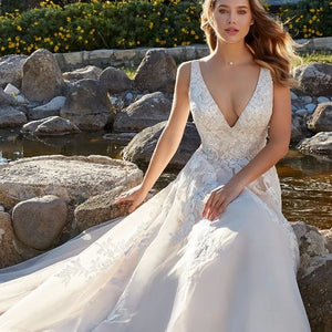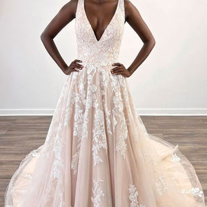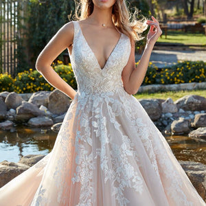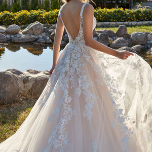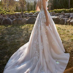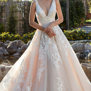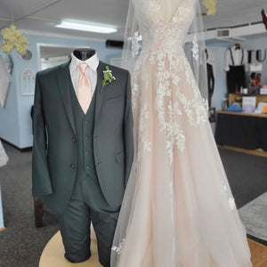 Champagne tulle A-line gown with ivory lace and sequins, champagne satin lining, fabric buttons to end of train.  Color: Ivory / Champagne.