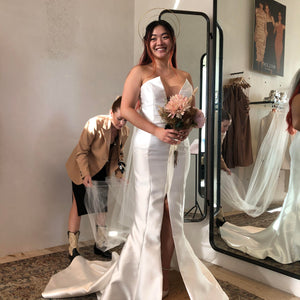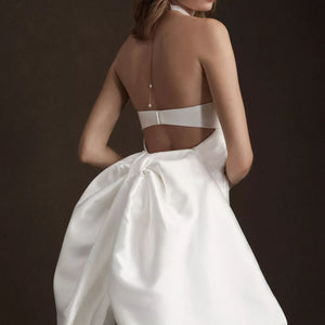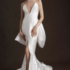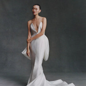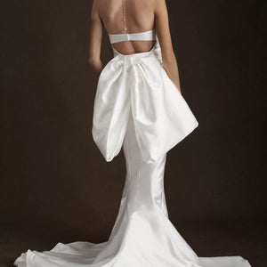 Leave your guests in awe with this enchanting and sculptural gown, complete with an ultra-plunging neckline, and glamorous fitted skirt. Crisp Mikado satin twill creates a statement silhouette for the modern bride. The fitted skirt has a center split to provide ease of movement. Does NOT come with the removable bow in the back (just the beautiful gown).