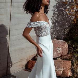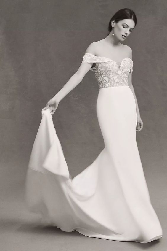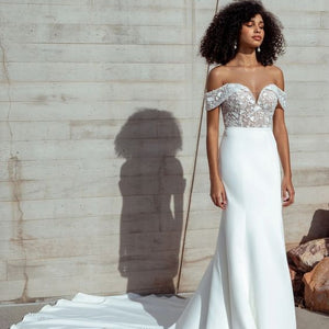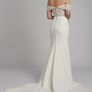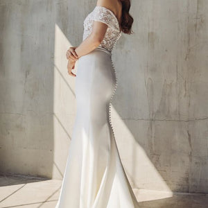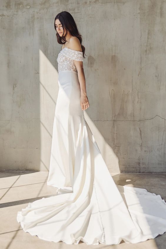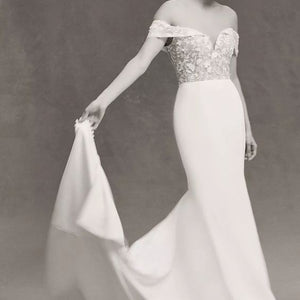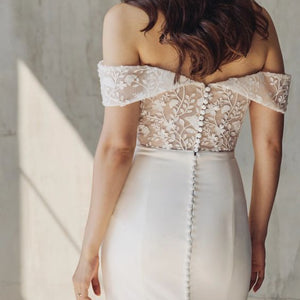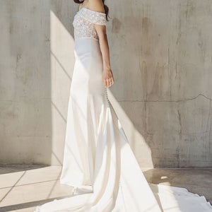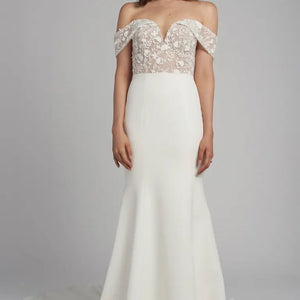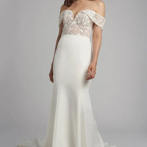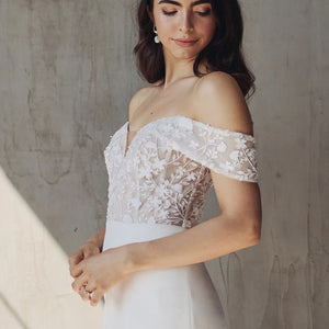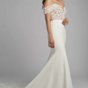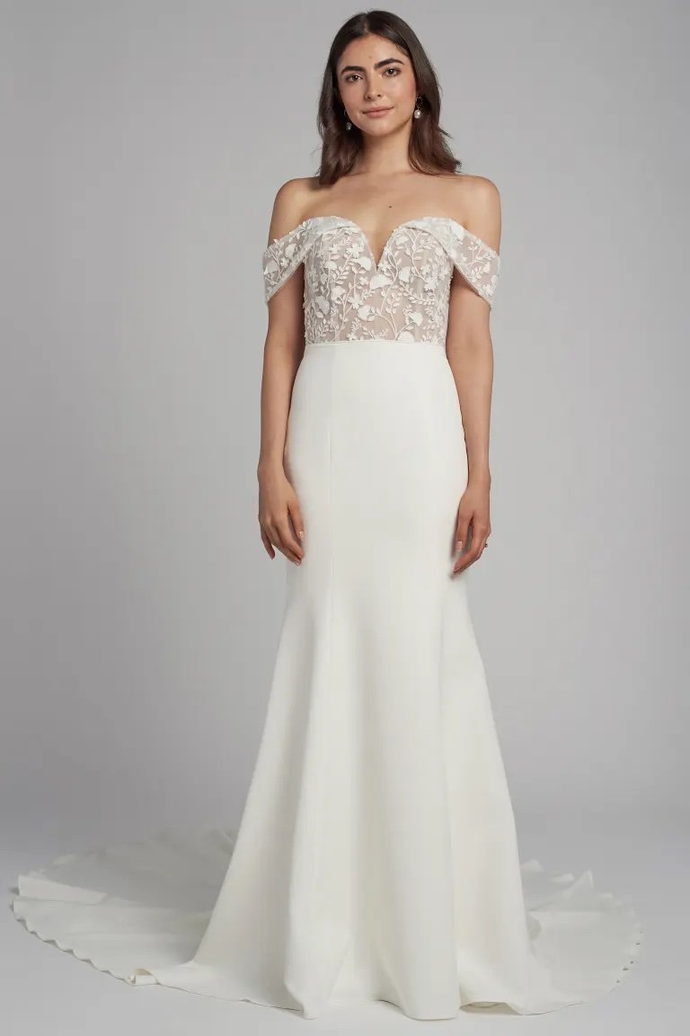 The Angelica bridal gown features a sheer illusion bodice adorned with our delicate Posie floral embroidery. An illusion insert at the neckline offers a peek of skin while lending support, and the off the shoulder sleeves drape elegantly over the bodice. Princess seams elongate the sleek fit and flare skirt, and covered buttons down the back highlight the dramatic train.