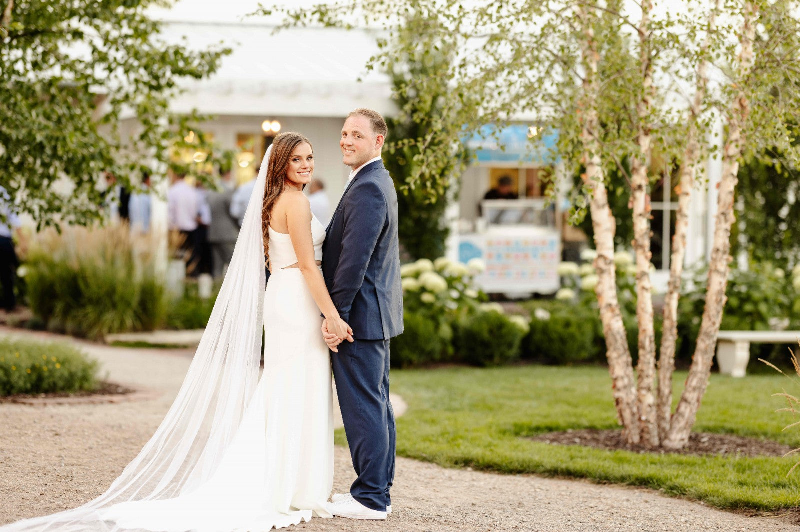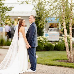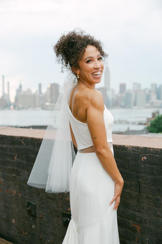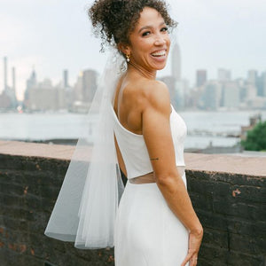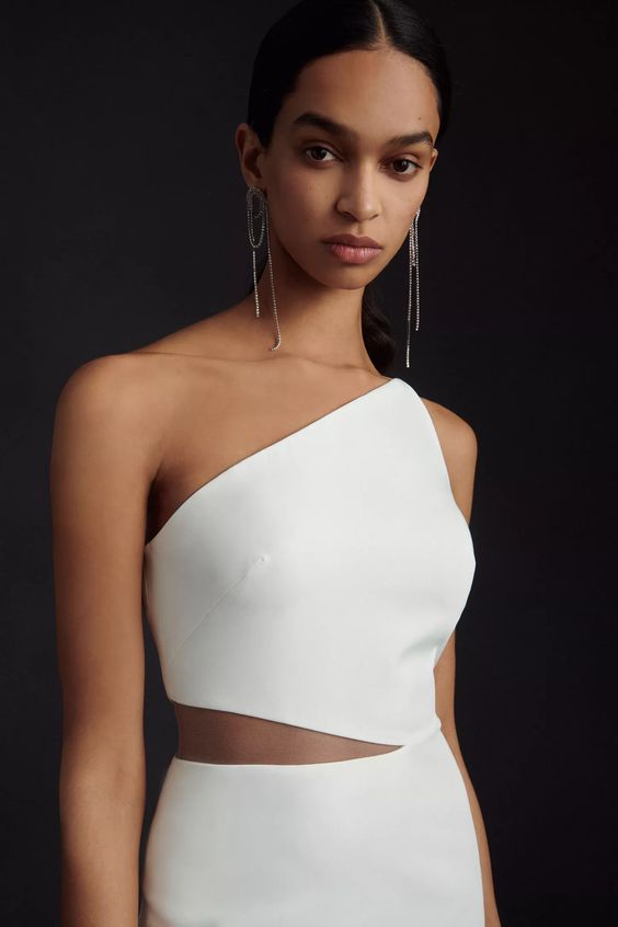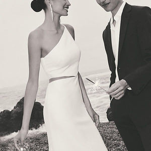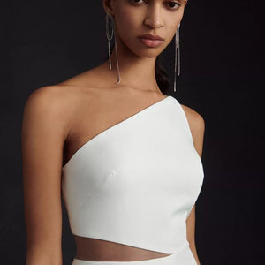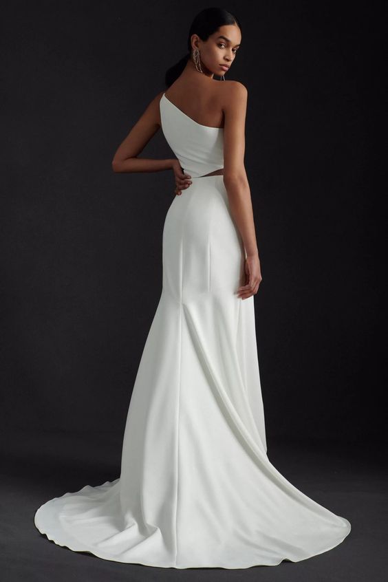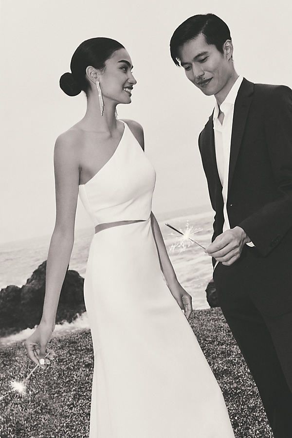 Made of the softest stretch crepe, the Jenny Yoo Blanca Fit & Flare Wedding Gown features one-shoulder styling, a side-waist illusion cutout, and a cascading chapel-length train that falls gently behind you.