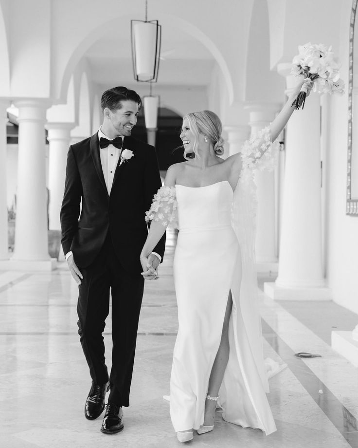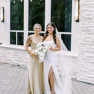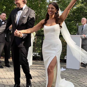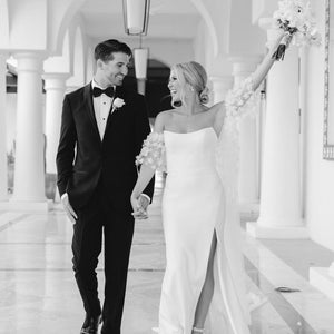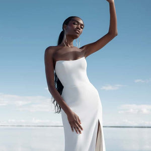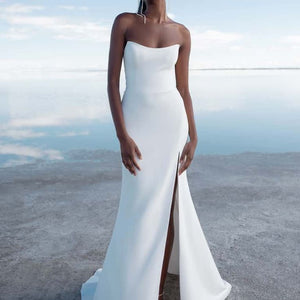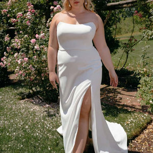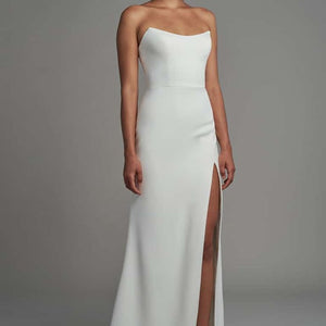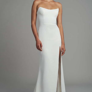 The Bryant strapless wedding gown takes a modern approach to a timeless bridal silhouette. A beautifully sculpted scoop neck and fully boned bodice effortlessly flatters the décolletage and collarbone, while a daring slit cuts across the slim fit and flare skirt. Covered buttons down to the hem add a classic bridal element.