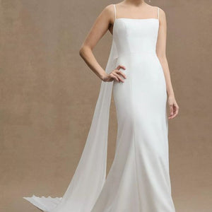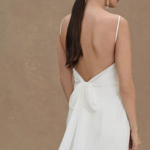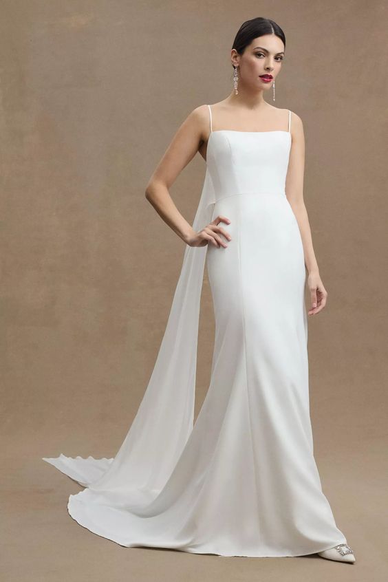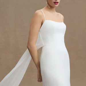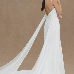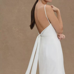 Soft-stretch crepe lends ease and movement to the elegant fit-and-flare Cami Gown. Barely there straps, an open back, and an ethereal sash add extra charm to this minimalist style.