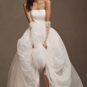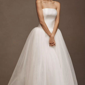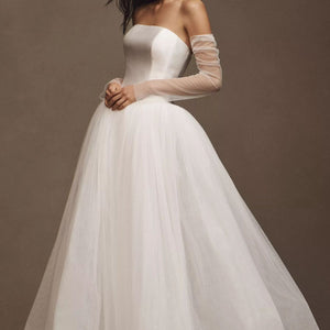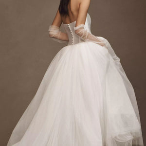 The Jenny Yoo Georgina Gown sweeps you into a romantic dreamscape with its layers of ethereal tulle, featuring a strapless corset-style bodice adorned with covered buttons along the back. The included gloves add timeless elegance to the ensemble.