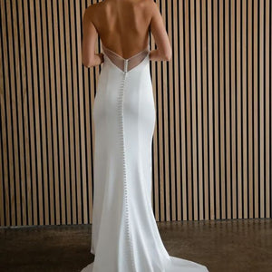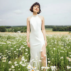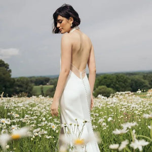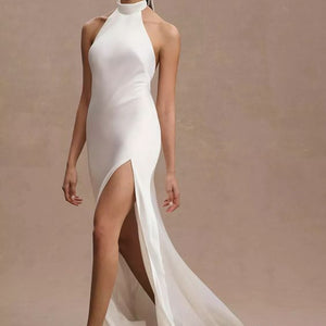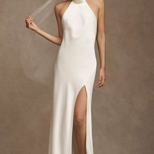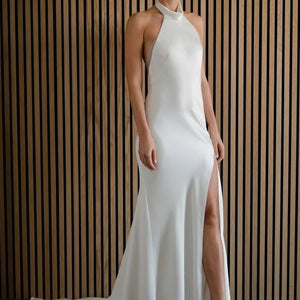 Sophisticated and alluring at once, the Jenny Yoo Harlyn Wedding Gown boasts a sleek high halter neck, intricate button detailing down the back, and a show-stopping front slit. Crafted of a soft satin, this polished silhouette makes a perfect wedding day look.