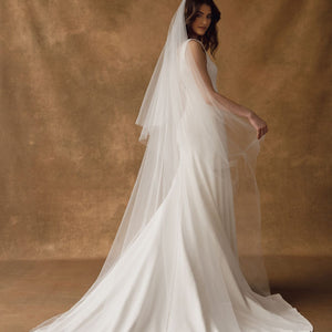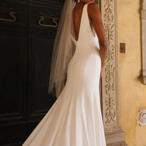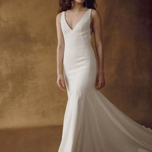 The Hughes by Jenny Yoo is the epitome of modern elegance. Cut in an Italian crepe fabric, it features a classic V neck and fit and flare silhouette sculpted by architectural seam lines that highlight and flatter your every curve. This dress is fully lined and features buttons all the way down the train.