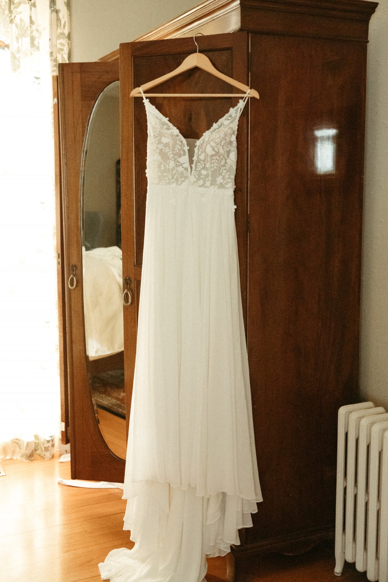 - Measures 63.5" from shoulder to hem; center-back length from neckline to train is 72"