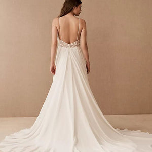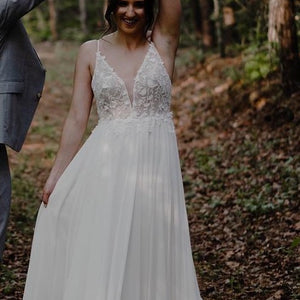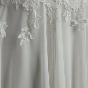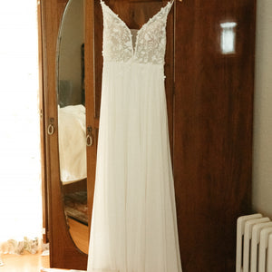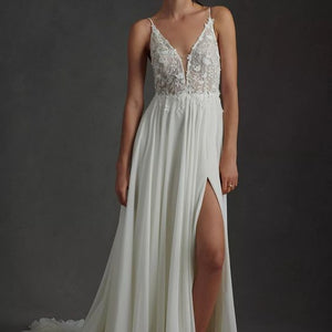 The Kelsey wedding gown by Jenny Yoo boasts intricate semi-sheer floral lace atop a deep-v bodice, with an illusion panel for structure. An ethereal, flowing skirt cascades to the floor, and a front-left slit adds dramatic allure.