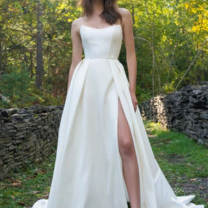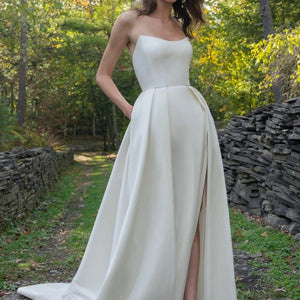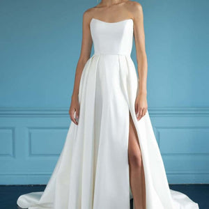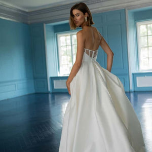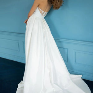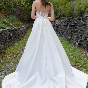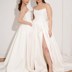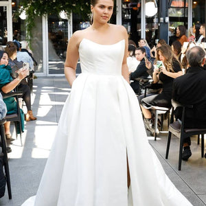 The Mollie gown adds thoughtful details to a classic silhouette. Featuring a beautifully structured bodice with a sultry scoop neckline with high peaks, the full A line skirt is elevated by inverted box pleats and a dramatic side slit. The sheer illusion back with exposed boning ensures a beautiful view from any angle, and covered buttons to the hem add one last classic bridal detail.