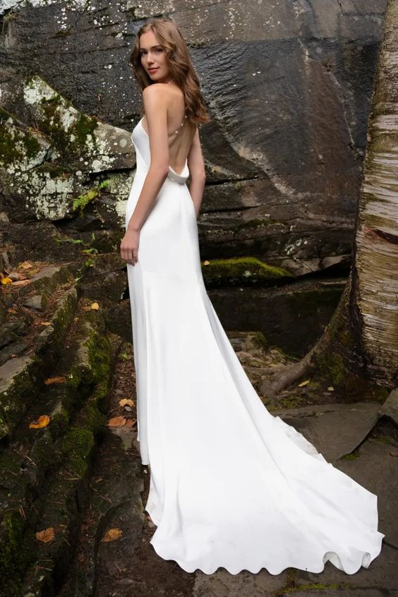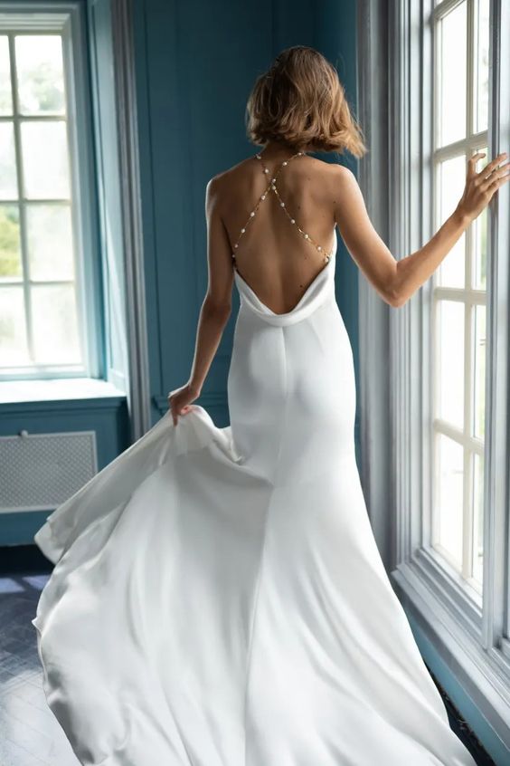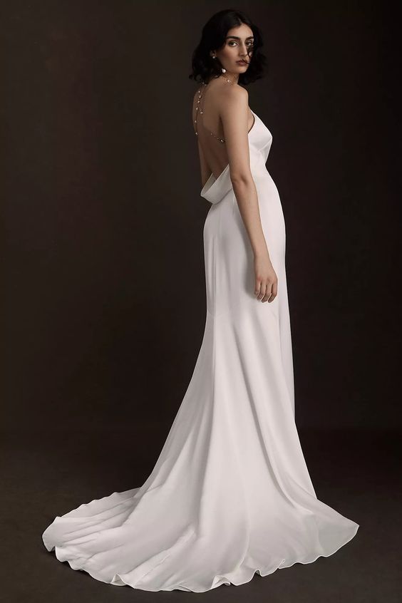 - Open back with draped cowl