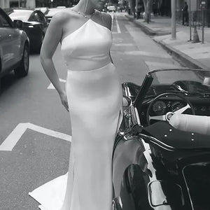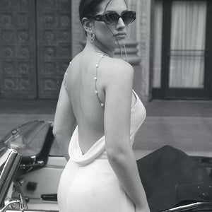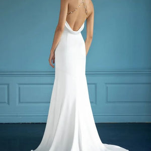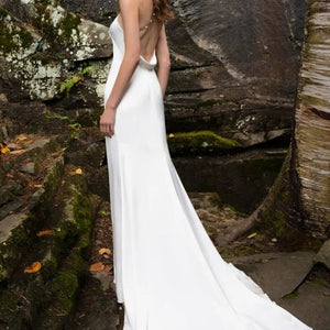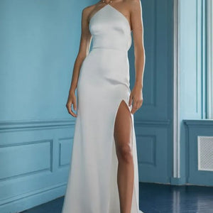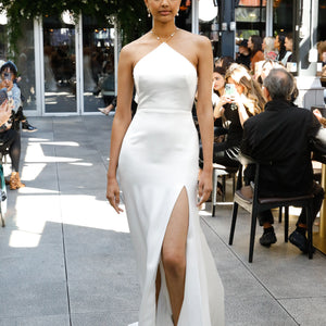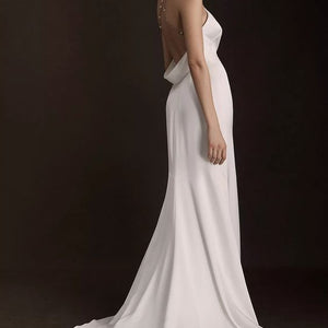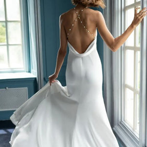 The Pearl gown is sleek and modern, with just the right amount of romance. The drapey luxe satin is cut in a flattering pointed halter shape, with a dramatic cutaway slit. A gold chain dotted with lustrous pearls makes an unexpected, yet elegant strap detail that crosses at the open back.
