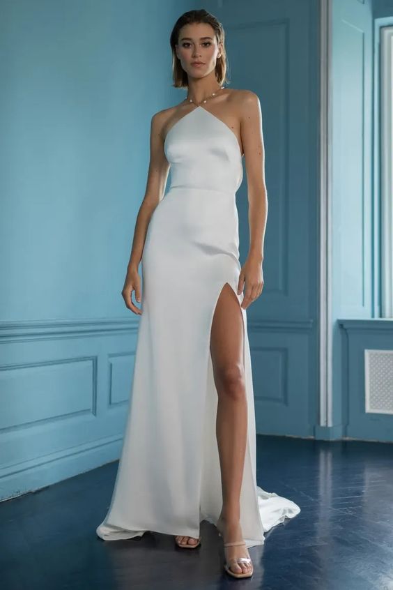 - Pointed halter neckline