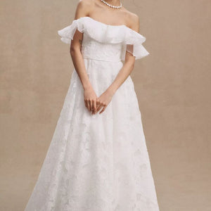 Has been tried on in store, but appears to be in like new condition. Does not come with removable off the shoulder ruffle (it's just a strapless dress). Very minor dust along the hemline (not a problem since most brides need to shorten the gown). Overall in excellent condition. Current style. Retail price: $1,995.