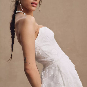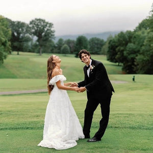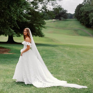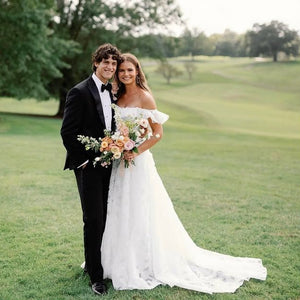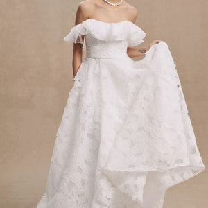 The Jenny Yoo Priscilla Wedding Gown features a romantic, full skirt and unique floral lace material.