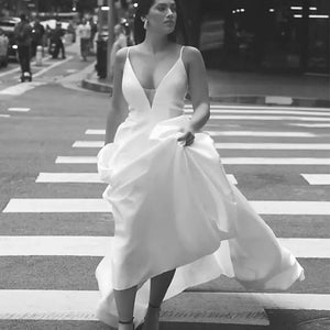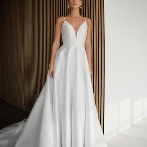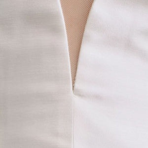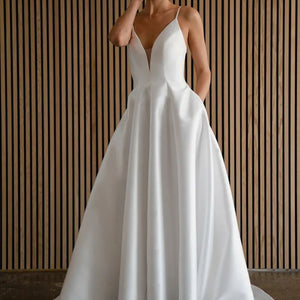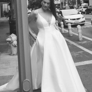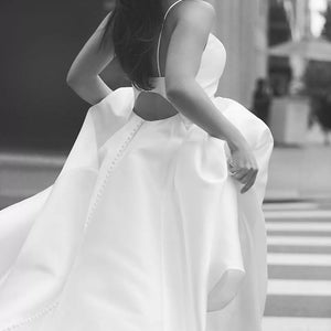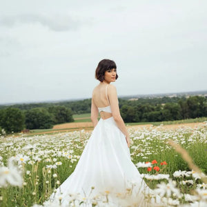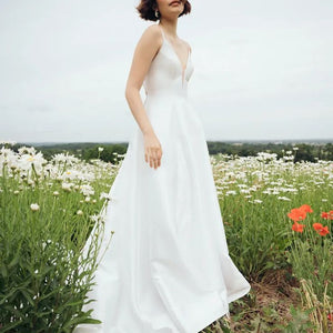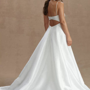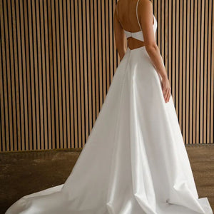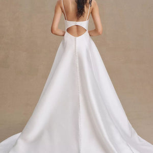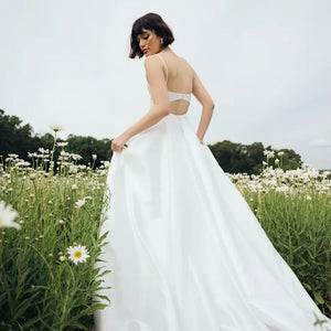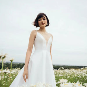 The Tamson gown, with her clean lines and modern details is absolutely timeless. Cut in our airy canopy taffeta, she has a beautifully textured finish with just a hint of sheen. Featuring a plunging neckline, a striking back cutout, and delicate buttons, the Tamson Wedding Gown pairs romantic details with modern, dramatic flair.