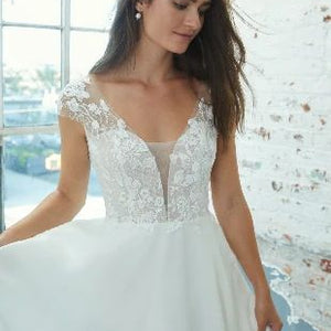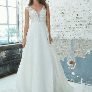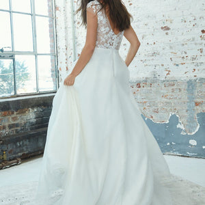 Kelly Faetanini Primrose is a graceful A-line gown of soft organza and beaded lace. The gown is finished with a plunging neckline, cap sleeves, and a modest train.