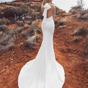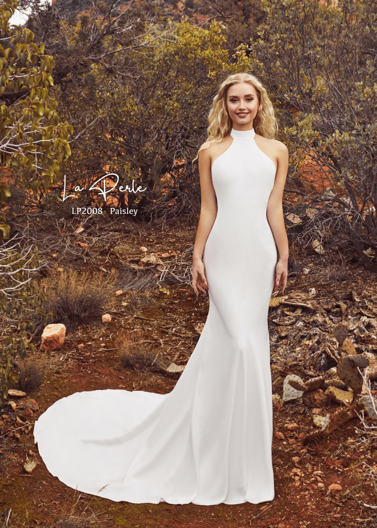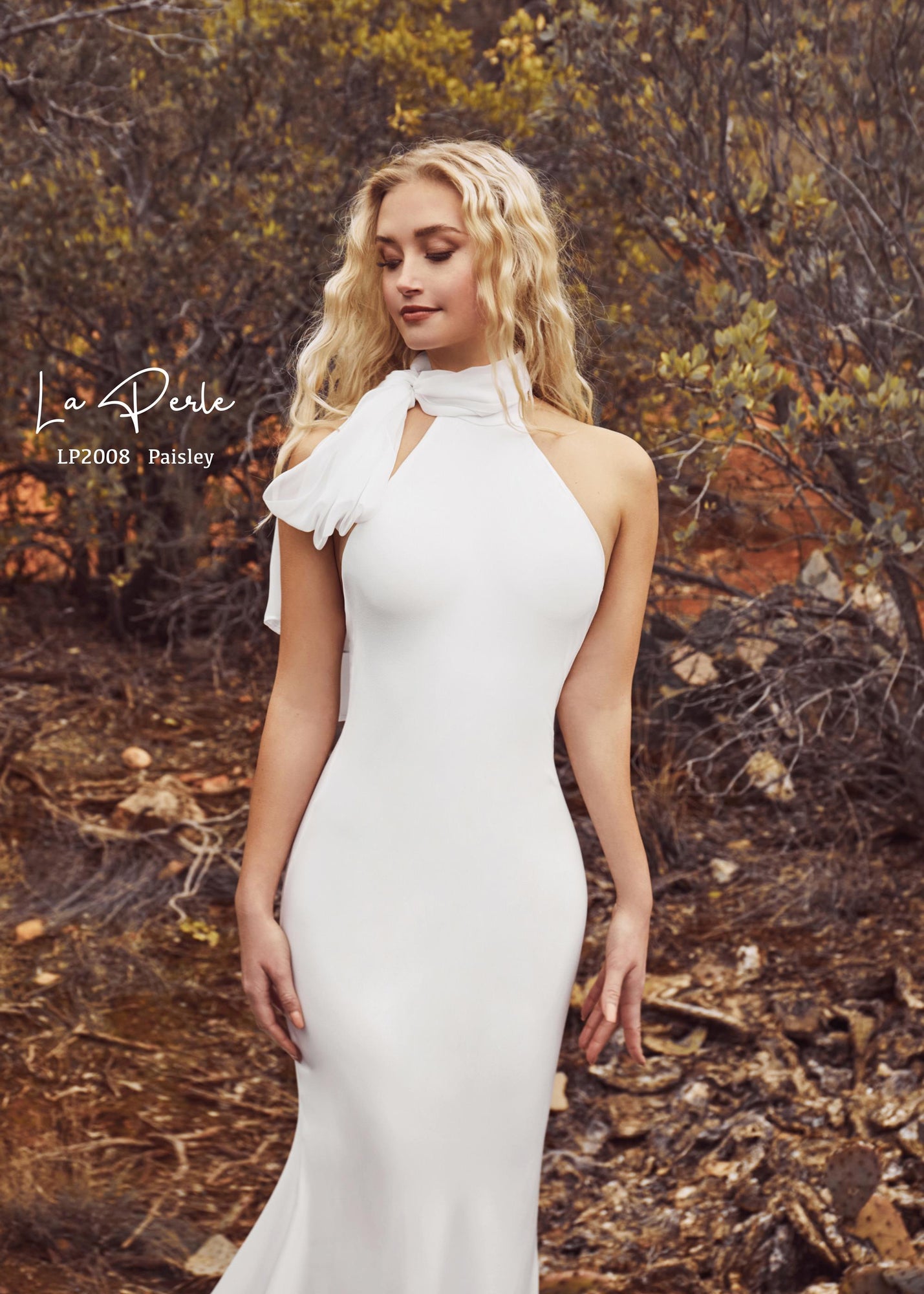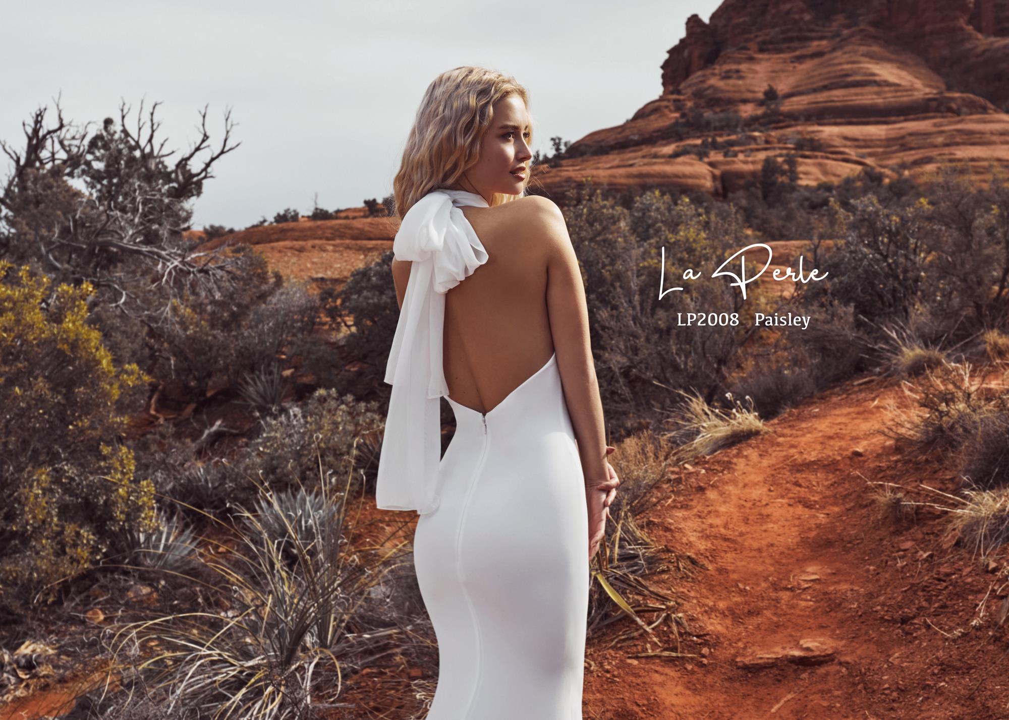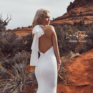 The La Perle line by Calla Blanche takes the bohemian style to heart. The Paisley gown is effortlessly enchanting and designed for the boho-chic free-spirited bride. The dress has a daring neckline, incredible silhouette, and is a truly unique and exquisite dress. The neck ribbon can be tied in the side or in the back.