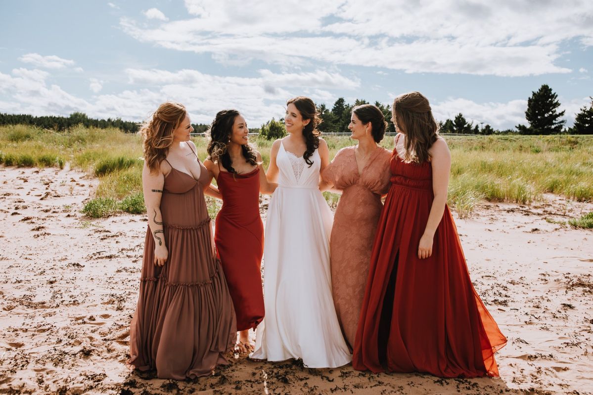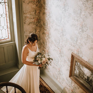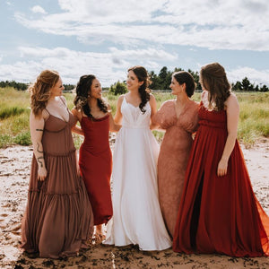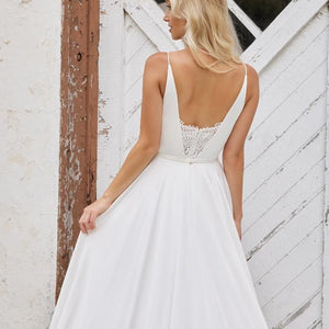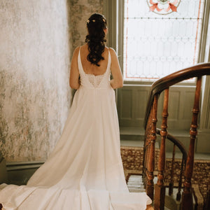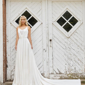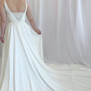 Equal parts simple and flirty. This lightweight gown features soft and buttery satin in a flowing a-line silhouette with a dramatic long train. But it's the details for us with a romantic lace sweetheart neckline and delicate spaghetti straps.