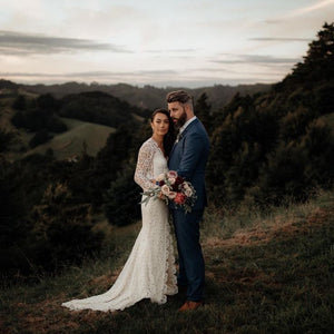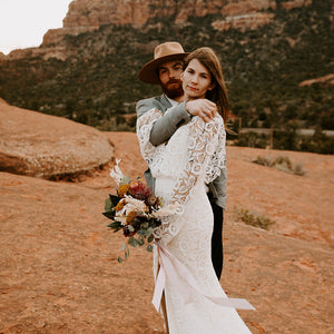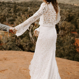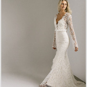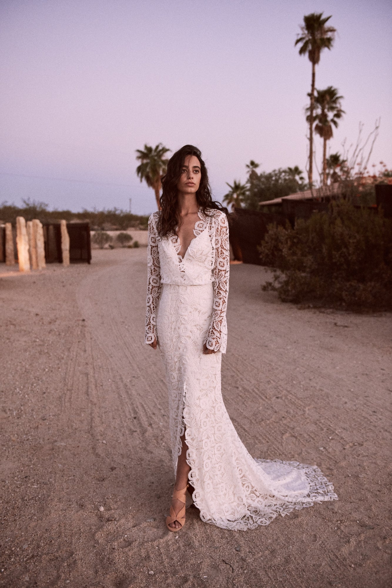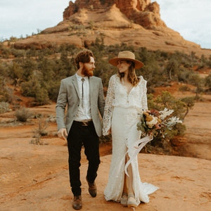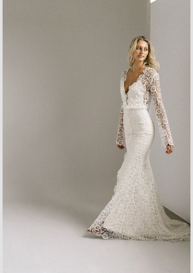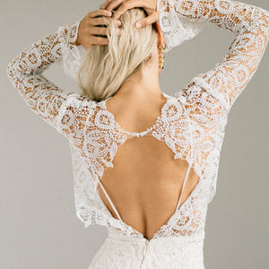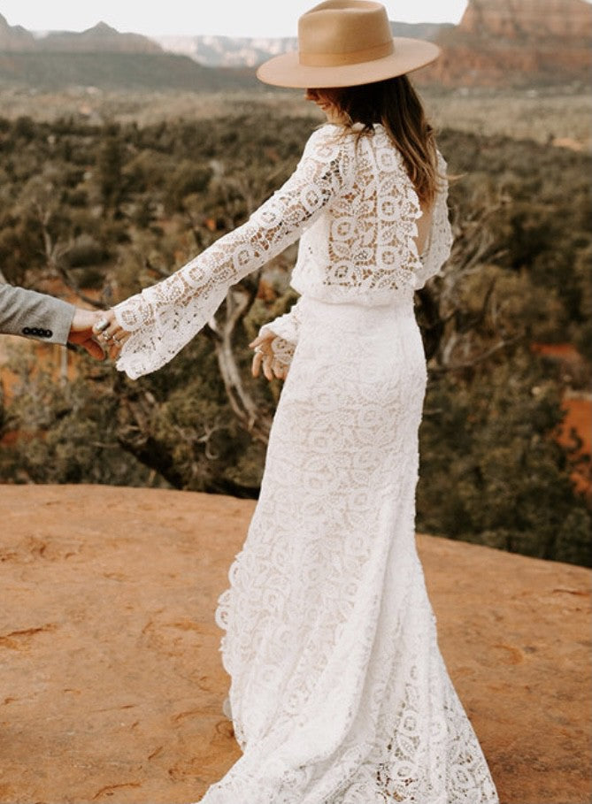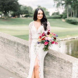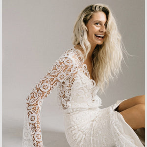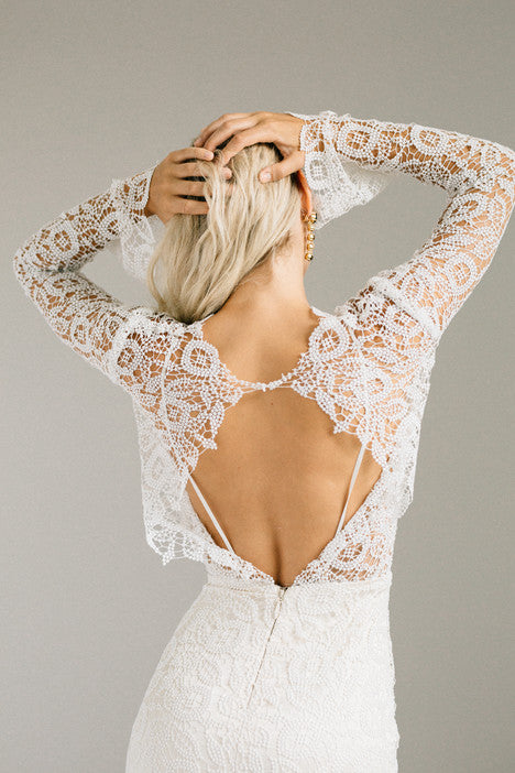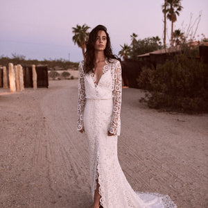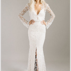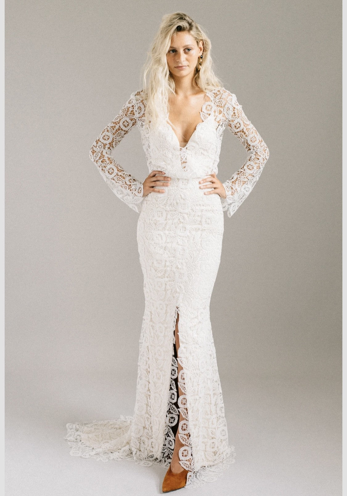 Calling the BOHO brides! Having an intimate wedding in the mountains or elopement? Halsey is calling your name. She's a bell sleeved lace gown with a center slit and a keyhole back. Roll the sleeves up for a cool, laid back look.